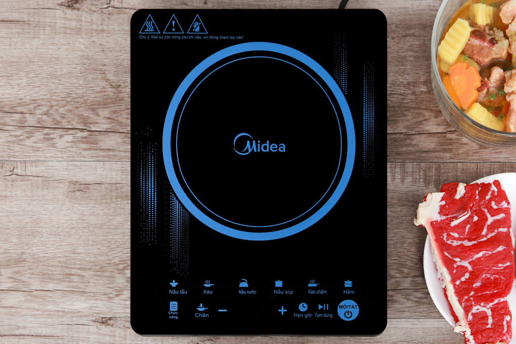 Bếp từ Midea MI-T2117DC có màu đen, họa tiết màu xanh nổi bật, sang trọng trong không gian đun nấu