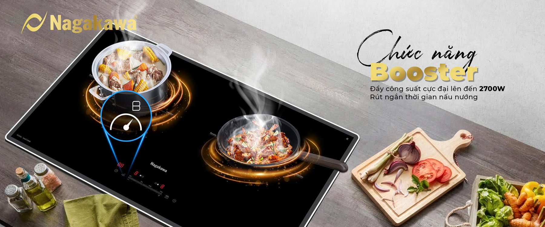 BẢNG ĐIỀU KHIỂN SLIDE & TOUCH CONTROL KẾT HỢP VÀ CHỨC NĂNG BOOSTER NẤU SIÊU NHANH Đẩy công suất cực đại lên đến 2700W và hoạt động liên tục trong 5 phút, giúp rút ngắn thời gian nấu nướng, giữ nguyên hương vị món ăn. Ngoài ra, bếp còn trang bị 9 mức công suất mạnh mẽ, chức năng hẹn giờ 1- 99 phút và kiểm soát thời gian nấu, tăng thêm tiện ích mở cho bạn chủ động sắp xếp hài hòa công việc cơm nước và công việc khác theo kế hoạch. Hệ điều khiển trung tâm cùng bảng điều khiển thông minh Slide & Touch Control tối ưu thao tác, sử dụng đơn giản, dễ dàng ghi nhớ.
