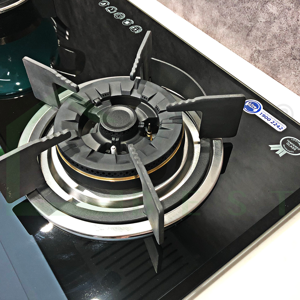 Bếp 02 lò: 01 lò to, 01 lò nhỏ Mâm chia lửa bằng đồng Hệ thống đánh lửa pin Pép hầm tiết kiệm gas Mặt kính cường lực, màu đen Kiềng gang đúc Lượng gas