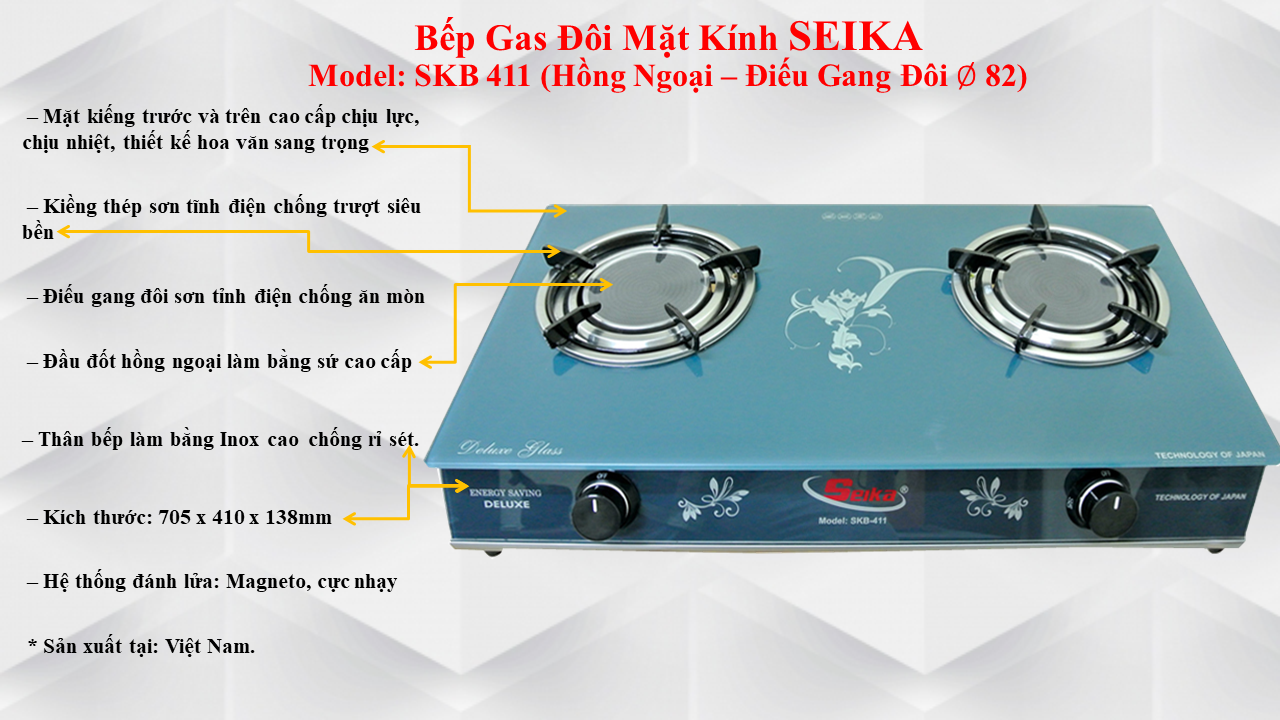 Bếp Gas Đôi Mặt Kính Seika ( Hồng Ngoại ) – Hàng Chính Hãng Model: SKB 217 – Mặt kiếng cao cấp chịu lực, chịu nhiệt, thiết kế hoa văn sang trọng – Thân bếp làm bằng inox chống rỉ sét. – Kiềng thép sơn tĩnh điện chống trượt siêu bền – Điếu inox chống ăn mòn – Đầu đốt bằng sứ cao cấp chống gió, chống nước – Kích thước: 700 x 410 x 135mm – Hệ thống đánh lửa: Magneto. * Sản xuất tại: Việt Nam. + Bếp Gas Đôi Mặt Kính Seika ( Hồng Ngoại) SKB217 – Hàng Chính Hãng có thiết kế nhỏ gọn, dễ dàng phù hợp với nhiều không gian bếp, ngoài ra với bề mặt kính luôn sáng bóng, dễ dàng vệ sinh sau khi sử dụng cùng họa tiết và màu sắc nổi bật. + Bếp SEIKA sẽ góp phần tiết kiệm gas, và tô điểm cho căn bếp nhà bạn thêm đẹp mắt và sang trọng.