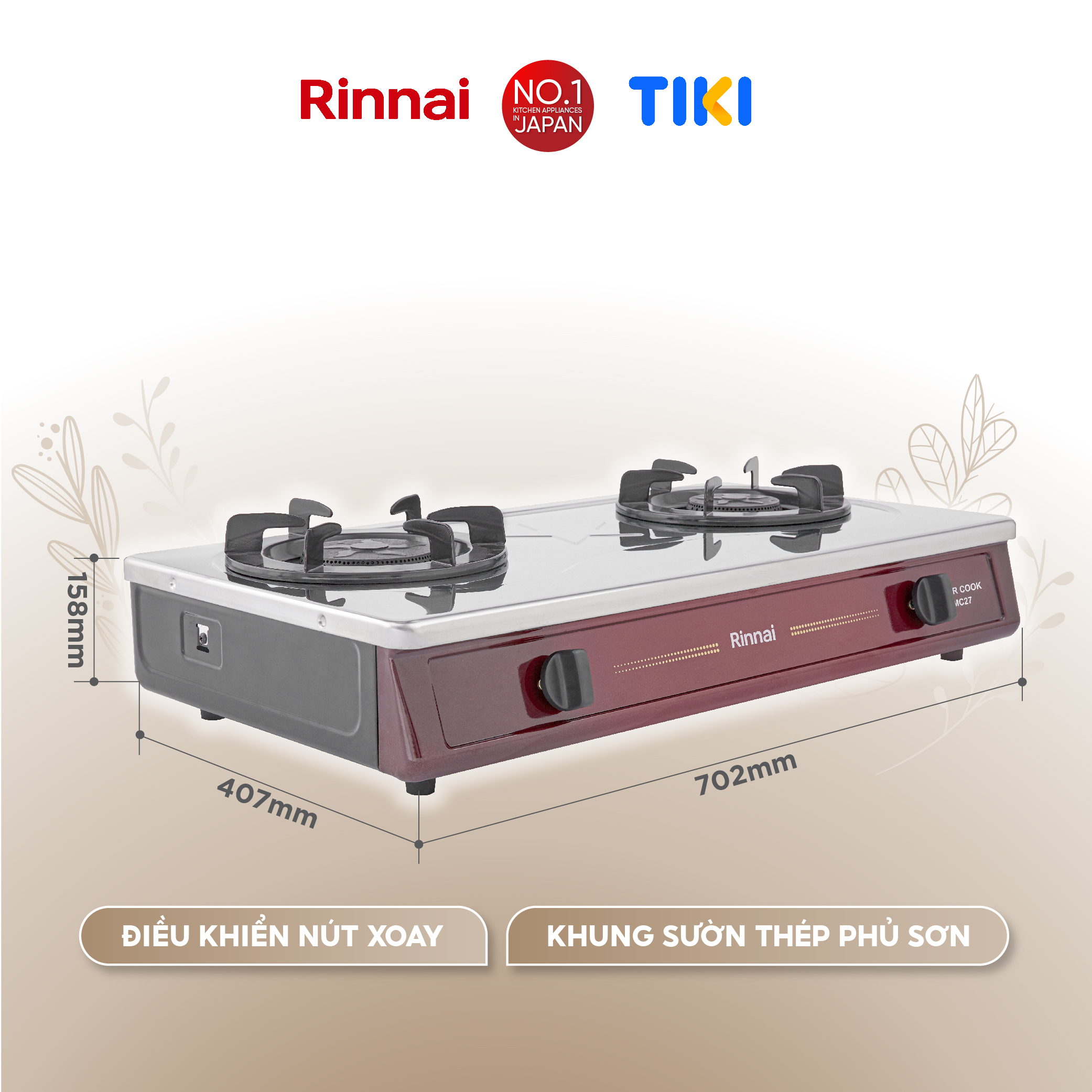 * Mặt kiếng cao cấp chịu lực, chịu nhiệt, thiết kế hoa văn sang trọng; - Thân bếp làm bằng inox chống rỉ sét, cao 60mm; - Núm vặn kiểu Rinnai; - Kiềng thép sơn