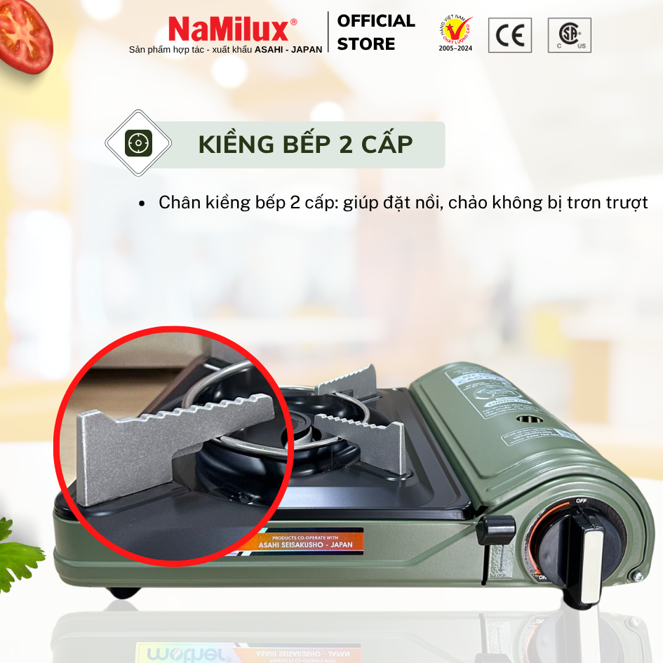 ĐẶC ĐIỂM NỔI BẬT ĐỘ AN TOÀN CAO Bếp gas mini NaMilux được trang bị hệ thống van Inline Cut - ngắt gas tự động, được sản xuất trên dây chuyền đạt chuẩn Quốc Tế