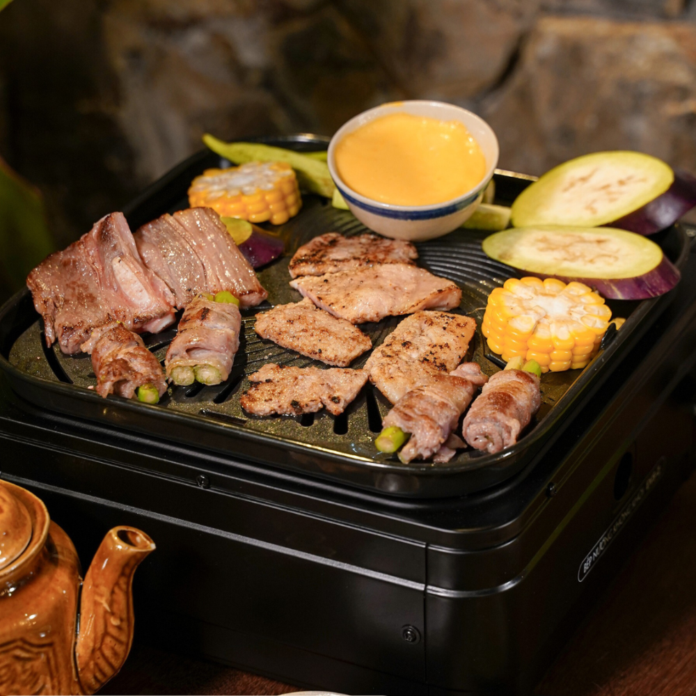 Bếp này hay ở chỗ là có thể ăn lẩu, nướng riêng hoặc vừa 1 bên nhúng lẩu, 1 bên lật thịt nướng cùng lúc nhờ 2 bếp chế độ độc lập. Lòng nồi đá