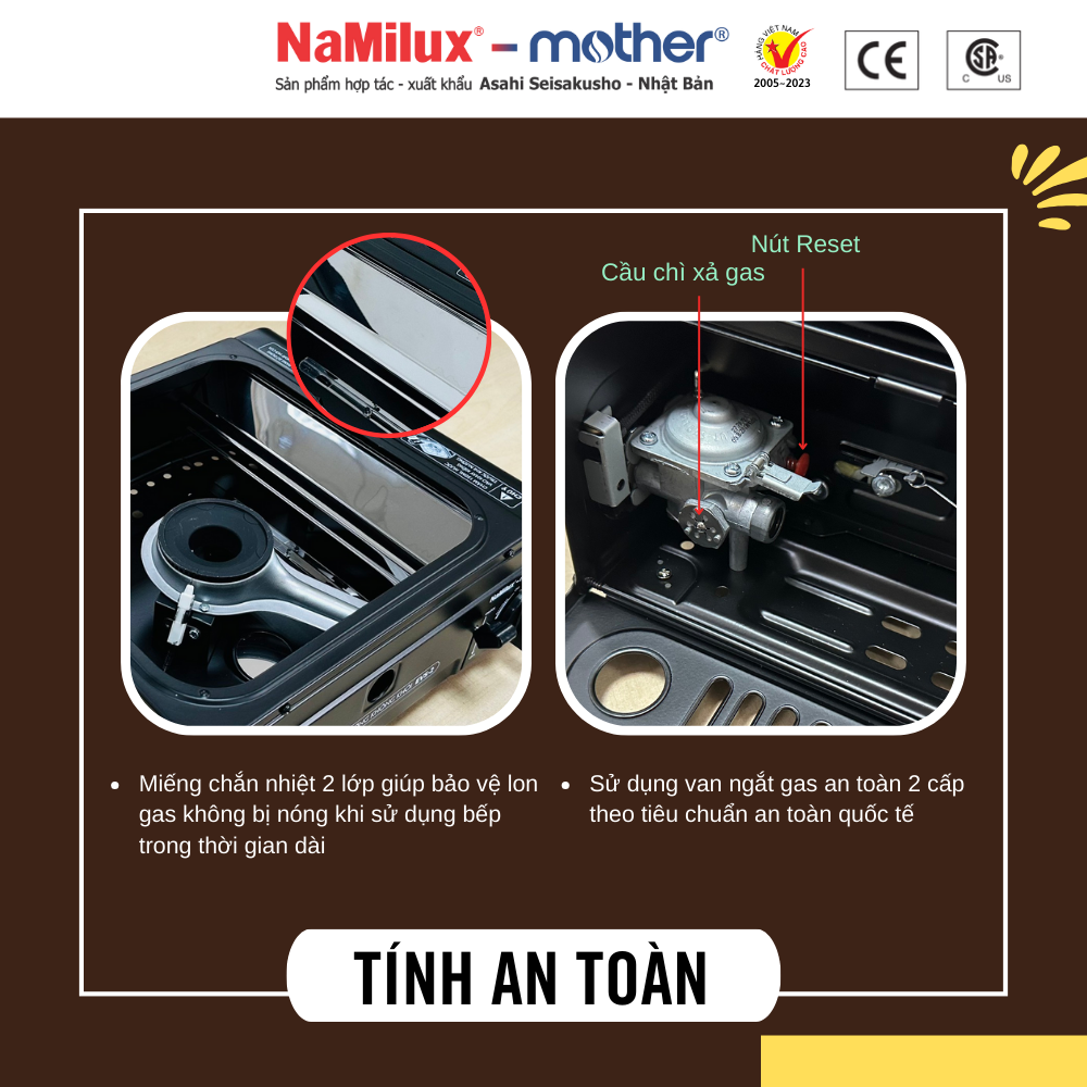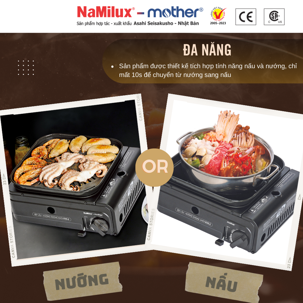 TIỆN ÍCH NHÂN ĐÔI – SÁNH ĐÔI LẨU NƯỚNG ⮚  Sản phẩm được tích hợp 2 chức năng nướng và nấu trên cùng 1 bếp. Chỉ cần 10 giây chuyển từ nướng sang nấu và ngược lại   CHỐNG GIÓ SIÊU VIỆT ⮚ Đầu đốt được thiết kế nằm hoàn toàn bên trong thân bếp:  Sử dụng được nơi có gió lùa, ngoài trời Đun sôi 1.5 lít nước trong vòng 10 phút   NƯỚNG KHÔNG KHÓI ⮚ Bếp có chức năng điều chỉnh nhiệt độ nướng – nấu. Chế độ nướng khống chế được nhiệt độ giúp thực phẩm nướng không bị cháy khét, ít khói ⮚ Thiết kế mặt vỉ nướng có các rãnh thoát mỡ giúp thức ăn ngon hơn và tốt cho sức khoẻ   TIẾT KIỆM 50% GAS ⮚ Sử dụng công nghệ đầu đốt trong, tối ưu hiệu quả đốt và tận dụng toàn bộ nhiệt lượng toả ra trong quá trình nấu   Tiết kiệm 50% gas tiêu thụ (1 lon gas có thể sử dụng liên tục 3 giờ)   AN TOÀN ⮚ Vỉ được đúc nguyên khối ADC12, mặt vỉ nướng được phủ lớp chống dính Teflon Whitford - USA, đạt chứng nhận an toàn thực phẩm của tổ chức FDA (Mỹ) ⮚ Sử dụng van ngắt gas an toàn 2 cấp theo tiêu chuẩn an toàn quốc tế. Miếng chắn nhiệt 2 lớp giúp bảo vệ lon gas không bị nóng khi sử dụng bếp trong thời gian dài   HƯỚNG DẪN SỬ DỤNG ⮚ Châm 150ml nước vào khay kiềng trước khi nướng ⮚ Lưu ý: Không được sử dụng nồi nấu lẩu có đường kính >22cm.    HƯỚNG DẪN VỆ SINH ⮚ Dùng khăn, giấy mềm để lau chùi thân bếp và vỉ nướng ⮚ Không dùng vật cứng nhọn tiếp xúc trực tiếp bề mặt vỉ nướng ảnh hưởng chất lượng Teflon ⮚ Chỉ được vệ sinh bằng nước sau khi ngừng nướng 10 phút   THÔNG SỐ KỸ THUẬT ⮚ Công suất: 1.65 kW (1,420 kcal/h) ⮚ Lượng gas tiêu thu: 120g/h ⮚ Sử dụng gas: Lon gas NaMilux mới ⮚ Khối lượng bếp + vỉ: 2.3kg ⮚ Kích thước bếp: C134 D306 R284 (mm) ⮚ Xuất xứ: Việt Nam  ⮚ Bảo Hành: 6 tháng Hàng chính hãng được phân phối độc quyền bởi Công Ty NAMILUX, chính sách 1 đổi 1 trong vòng 14 ngày nếu sản phẩm thuộc lỗi nhà sản xuất.