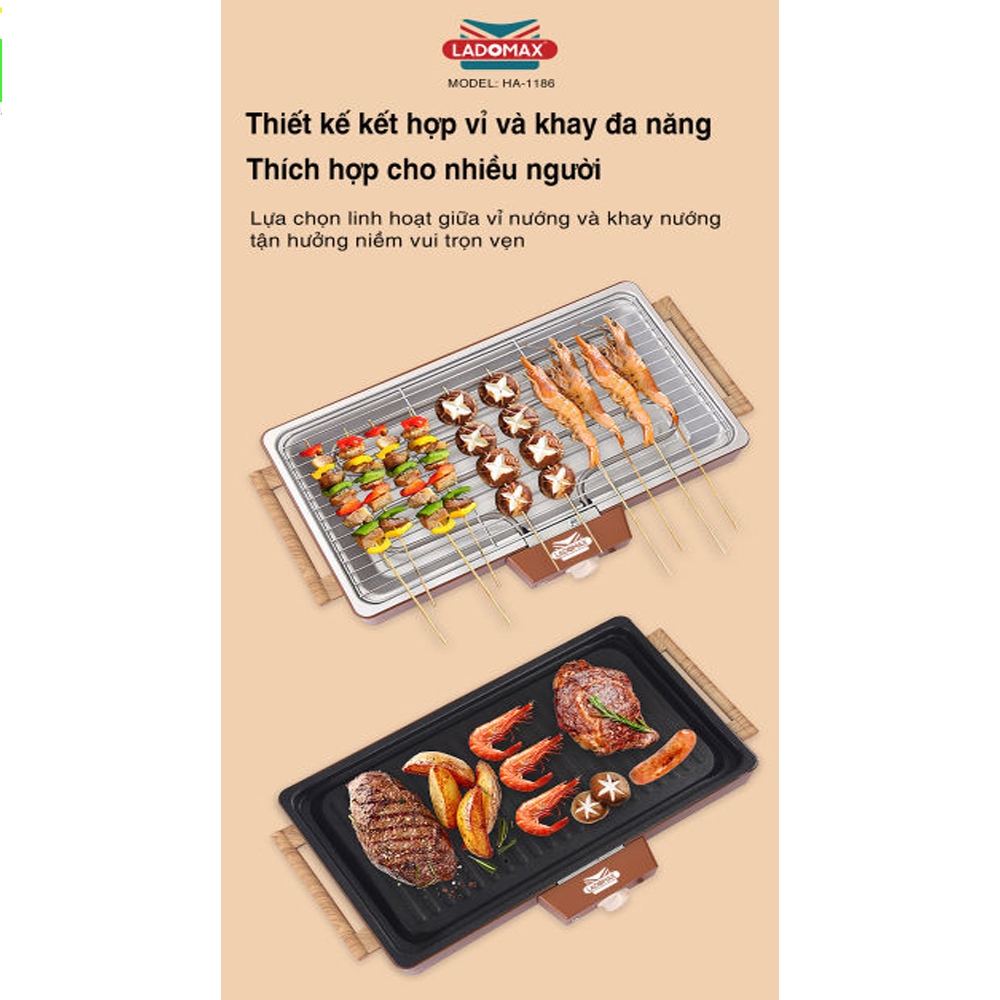 ✨Bếp nướng điện 2 vỉ 1500W Ladomax HA-1186 có vỉ nướng và khay nướng rời để nướng được nhiều loại thức ăn hơn-Hàng chính hãng