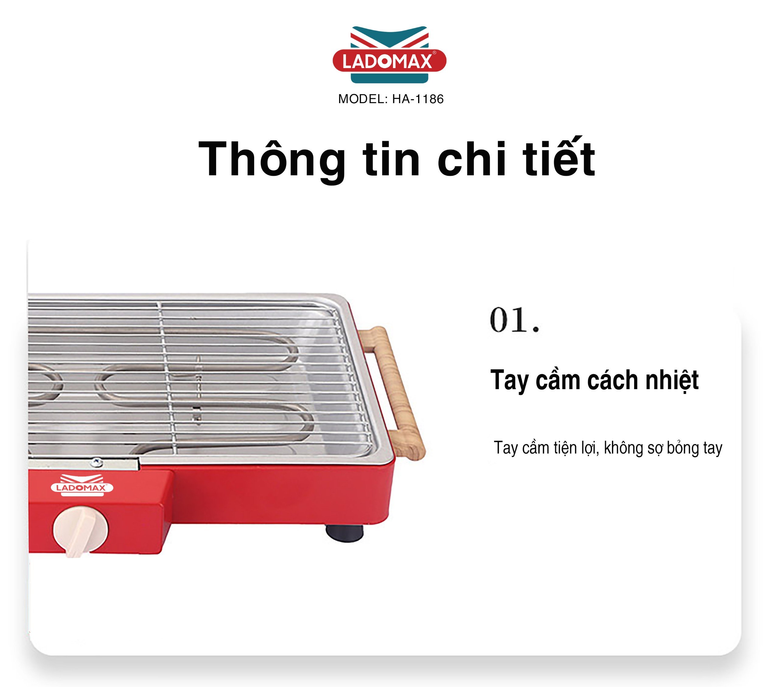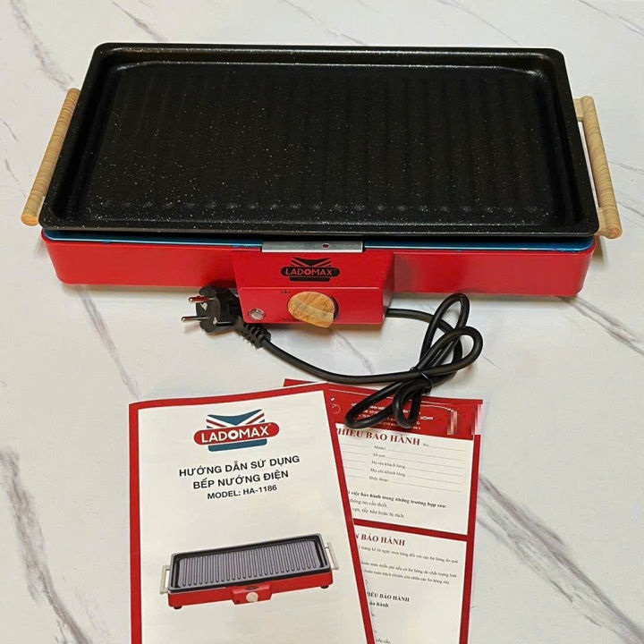 - Tên sản phẩm: BẾP NƯỚNG ĐIỆN ĐA NĂNG - Thương hiệu: LADOMAX - Model: HA-1186 - Điện áp: 220V - 50Hz - Công suất: 1500W - Cáu tạo :rời - Chất liệu Khay nướng:Nhôm