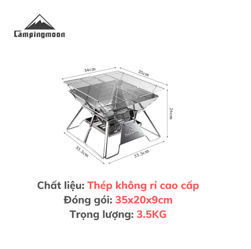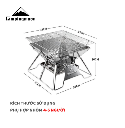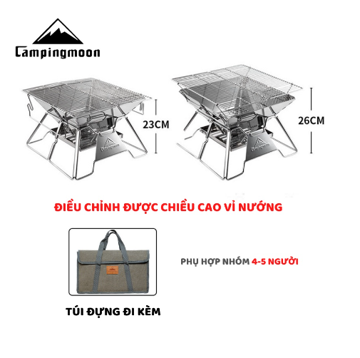 MÔ TẢ SẢN PHẨM BẾP NƯỚNG THAN HOA GẤP GỌN CHO 5-8 NGƯỜI CAMPINGMOON MT-3 * THÔNG TIN SẢN PHẨM: - Thương hiệu: Campingmoon - Mã sản phẩm: MT-3 - Chất liệu: stainless steel, iron