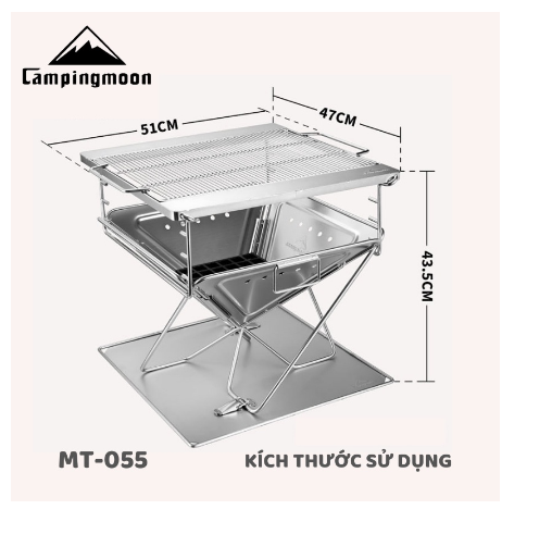 BẾP NƯỚNG THAN HOA GẤP GỌN 8-10 NGƯỜI CAMPINGMOON MT-055 * THÔNG TIN SẢN PHẦM: - Thương hiệu: Campingmoon - Mã sản phẩm: MT-055 - Chất liệu: Thép không gỉ, Gang, Inox - Kích thước lắp ráp (W x D x H): 51 x 47 x 43,5 cm - Kích thước túi đựng: 45 x 45 cm - Kích thước vỉ nướng: 32 x 44 cm. Ống thép đặc phi 8 mm - Tổng trọng lượng: Xấp xỉ 10,6 kg - Phụ kiện: Túi lưu vải Polyester - Xuất xứ Nhật Bản, lắp ráp tại Trung Quốc