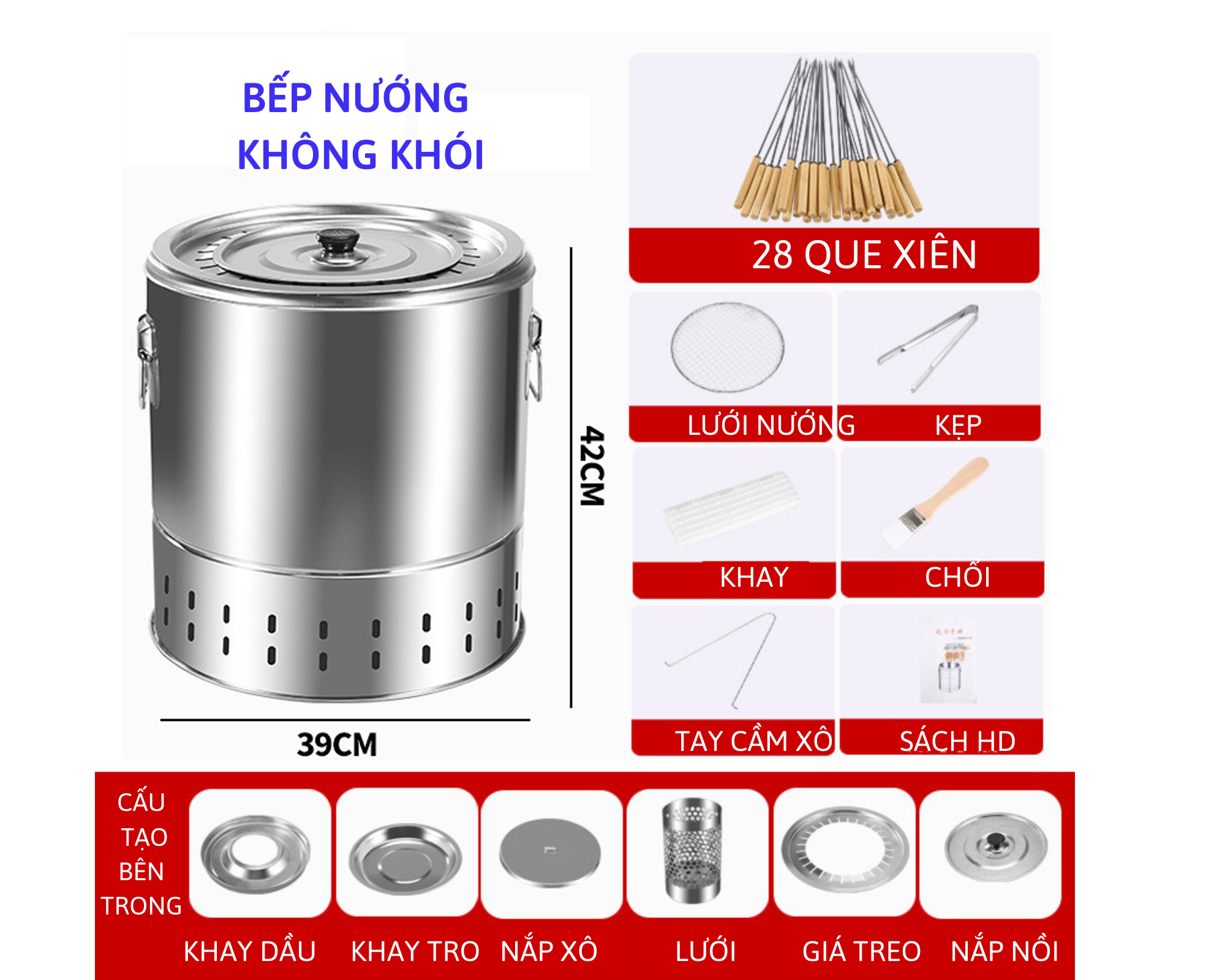 1. THÔNG TIN CHI TẾT - Kích thước: Đường kính 39cm, cao 42cm - Số xiên tối đa có thể cài cùng lúc vào bếp: 28 xiên - Chi tiết: Thân bếp: Inox 201, que
