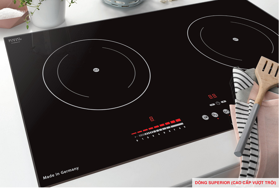 • Bếp 02 từ. • Mặt kính Schott Ceran Made in Germany siêu bền, chịu lực chịu sốc nhiệt • Bo mạch EGO Made in Germany • Đầu đốt EGO Made in Germany • Công
