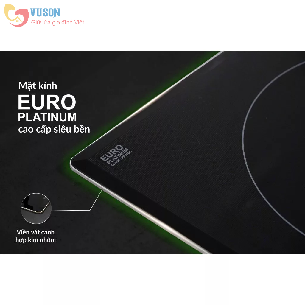 Mặt kính EURO PLATINUM bo viền kim loại, vát cạnh Chức năng hâm nóng Warming nhiều mức Tính năng tự động nhận nồi Chức năng tạm dừng Chức năng nấu mở rộng: Chiên xào, Rã