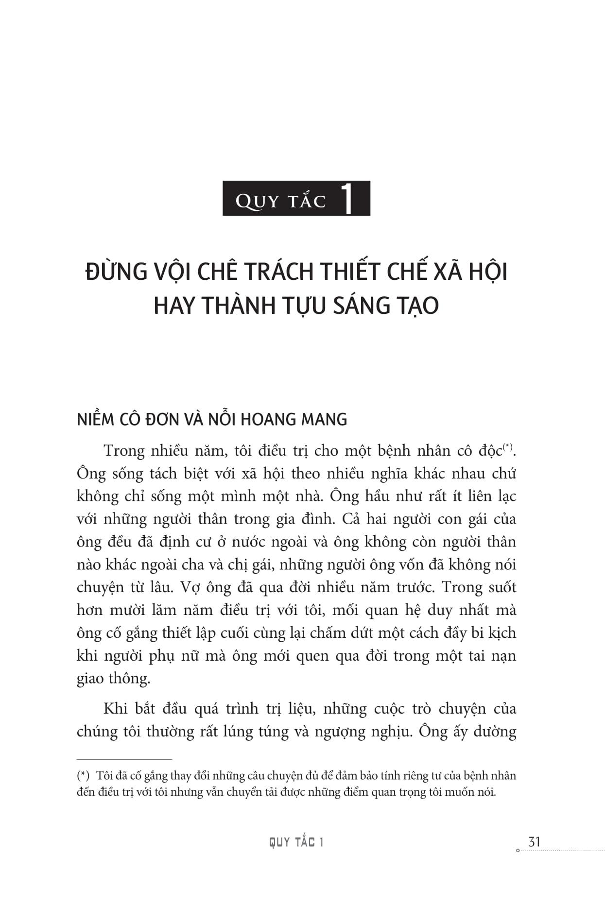 Với quyển sách này, bạn không cần đọc từ chương đầu đến chương cuối, chỉ cần lật giở một trang sách bất kì, bạn sẽ nhận được những kỹ năng đương đầu với rủi ro, hỗn độn từ Jordan Peterson. Xuyên suốt 12 quy luật là thông điệp có giá trị từ Kinh Thánh, từ những biến cố, các câu chuyện thực tế trong chính cuộc sống của tác giả.12 quy tắc của giáo sư Peterson huyến khích người đọc tiếp cận với lĩnh vực xa hơn. Đây là điều cần thiết để thích nghi với một thế giới luôn thay đổi. Những quy tắc này sẽ là kim chỉ nam giúp bạn tìm thấy mấu chốt cho câu hỏi: Ta phải làm gì khi rơi vào nghịch cảnh? 12 quy tắc của giáo sư Peterson huyến khích người đọc tiếp cận với lĩnh vực xa hơn. Đây là điều cần thiết để thích nghi với một thế giới luôn thay đổi.