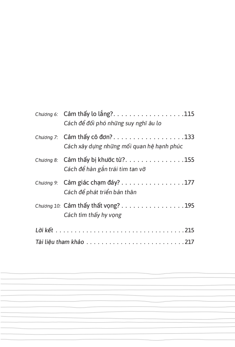 Phần 3: Đối phó thế nào? Phần này sẽ mang đến các chiến lược dài hạn để chuyển hóa một cảm xúc hay tâm trạng tiêu cực nào đó. Quyển sách sẽ giới thiệu với các bạn các kế hoạch phát triển nội tại để xây dựng sức bật, khả năng tự phục hồi cũng như khả năng đương đầu với khó khăn.
