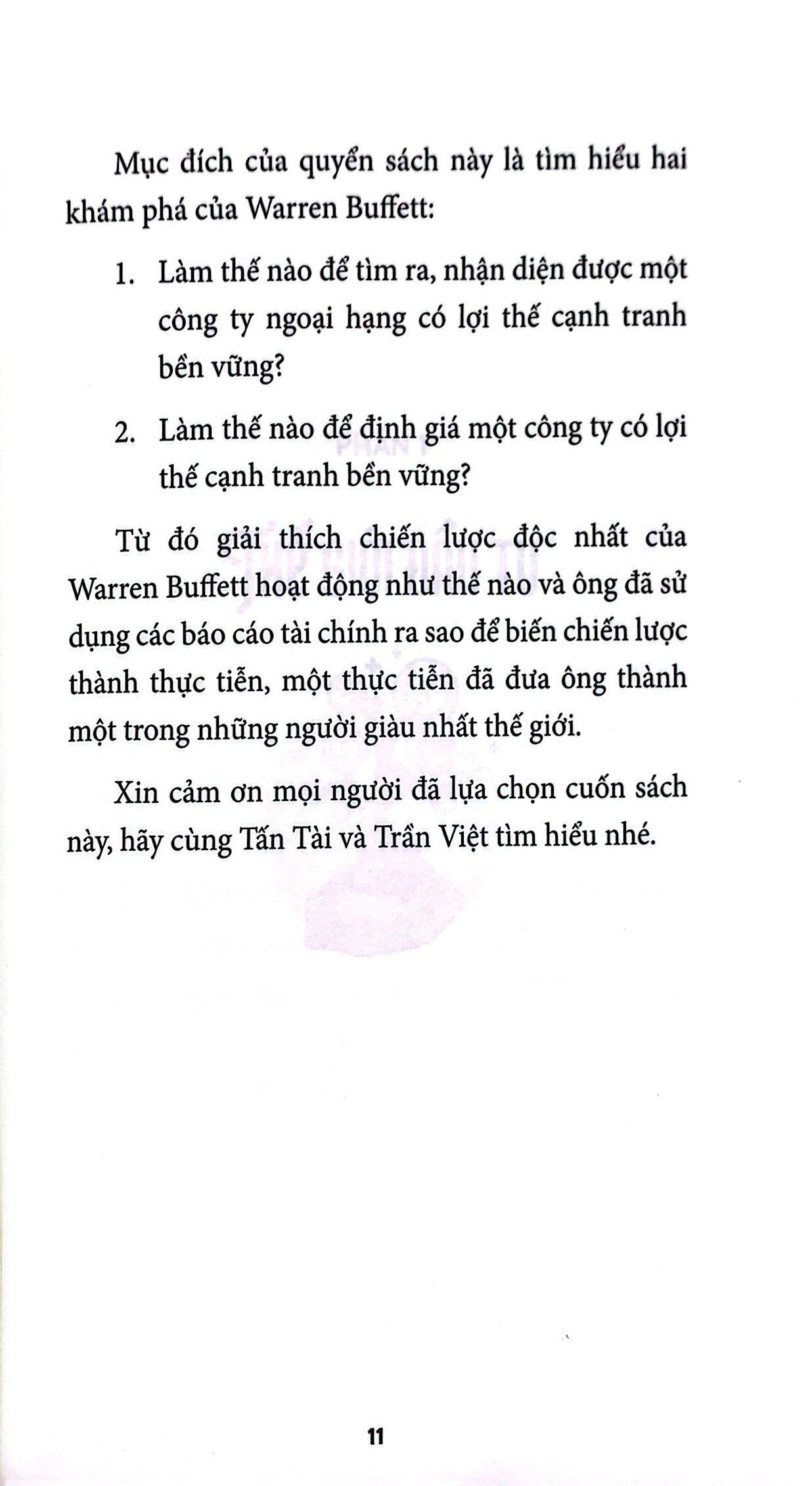 Cuốn sách tập trung tìm hiểu hai khám phá của Warren Buffett - “ông trùm” kinh doanh và đầu tư nổi tiếng thế giới, và cũng là hai vấn đề cốt yếu nhất mà một nhà đầu tư chứng khoán cần hiểu rõ. Thứ nhất, là cách để tìm ra cũng như nhận diện được một công ty ngoại hạng có lợi thế cạnh tranh bền vững. Và thứ hai, là cách để định giá một công ty có đặc điểm như vậy. Xuyên suốt cuốn sách, các tác giả giải thích chiến lược độc nhất mà Warren Buffett áp dụng và cách ông sử dụng các báo cáo tài chính để biến chiến lược thành thực tiễn – Điều đã giúp ông trở thành một trong những người giàu nhất thế giới.