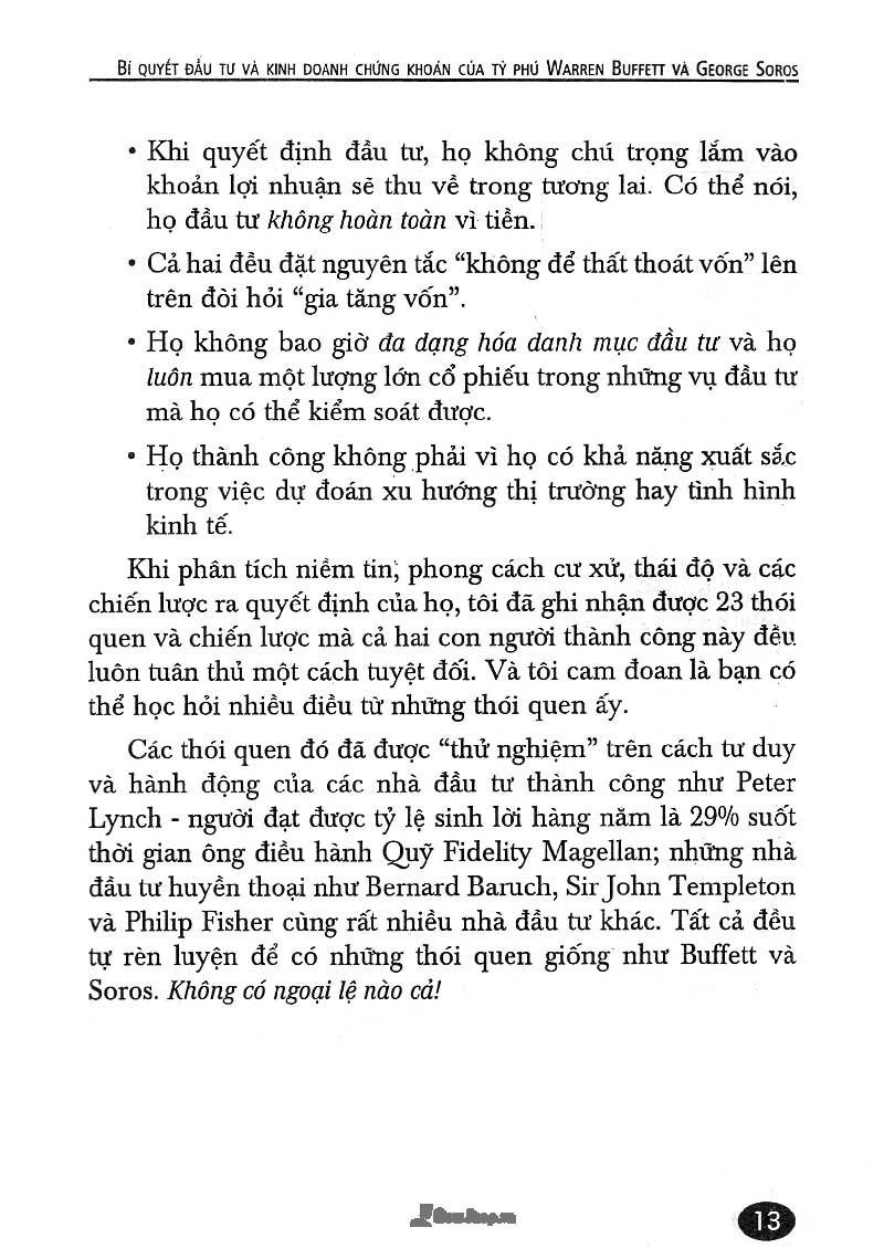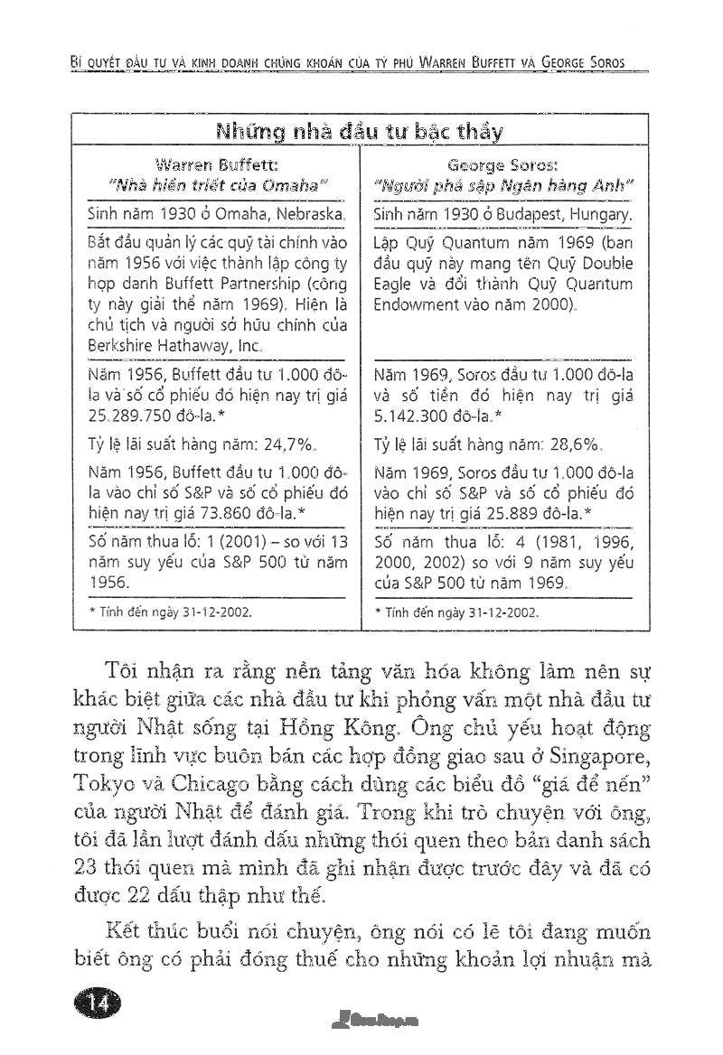 Bí Quyết Đầu Tư Và Kinh Doanh Chứng Khoán Của Tỷ Phú Warren Buffett Và George Sorosviết về Warren Buffett Và George Soros đều khởi nghiệp từ hai bàn tay trắng, và họ cùng làm nên những gia tài trị giá hàng chục tỷ đô la chỉ bằng một hoạt động đầu tư. Tuy nhiên, sự nghiệp của hai người lại trái ngược và mâu thuẫn với nhau như mặt trăng mặt trời.