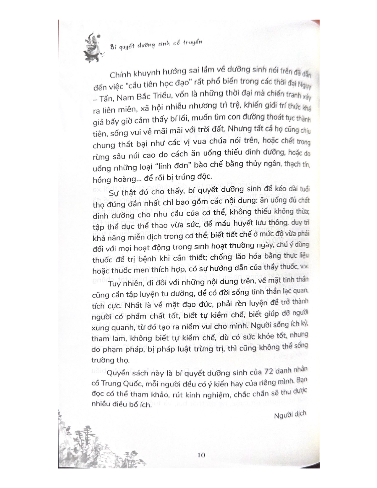 Về cơ bản, bí quyết dưỡng sinh để kéo dài tuổi thọ chỉ gói gọn trong những vấn đề sau: ăn uống đủ chất dinh dưỡng tập thể dục thể thao vừa sức, sinh hoạt điều độ, dùng thuốc theo hướng dẫn của thầy thuốc để trị bệnh,... Bên cạnh các cách dưỡng thân như thế, người cao tuổi cũng cần phải dưỡng tâm, bằng cách sống tích cực, tinh thần luôn lạc quan, lấy việc giúp đỡ người khác làm niềm vui. Làm được những điều đó, người cao tuổi sẽ có thêm những năm tháng cuối đời viên mãn, thoải mái, thay vì phải sống trong cảnh bệnh tật, đau khổ. Quyển sách này đã tổng hợp và tóm tắt những điểm nổi bật trong bí quyết dưỡng sinh của 72 danh nhân cổ Trung Quốc. Hy vọng bạn đọc có thể tham khảo, rút kinh nghiệm và thu thập được nhiều điều bổ ích.