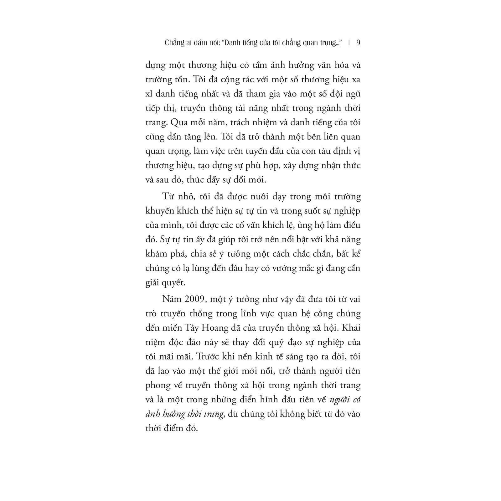 Vào thời điểm đọc cuốn sách này, trên cương vị là nhà sáng lập Pencil Group (pencil), người cũng đang trong hành trình không ngừng nỗ lực xây dựng một công ty, một thương hiệu cá nhân gắn liền với triết lý sáng tạo, đổi mới, cam kết phục vụ cộng đồng, tôi nhận rằng để tạo dựng niềm tin và sự ảnh hưởng, bạn cần vượt qua ranh giới của chức danh công việc, và bước vào hành trình định thân. Và với tất cả những điều đó, cuốn sách này sẽ không chỉ là kim chỉ nam trong việc xây dựng thương hiệu cá nhân, hơn thế nó còn là nguồn cảm hứng để bạn khám phá tiềm năng của bản thân và dũng cảm bước ra khỏi vùng an toàn.