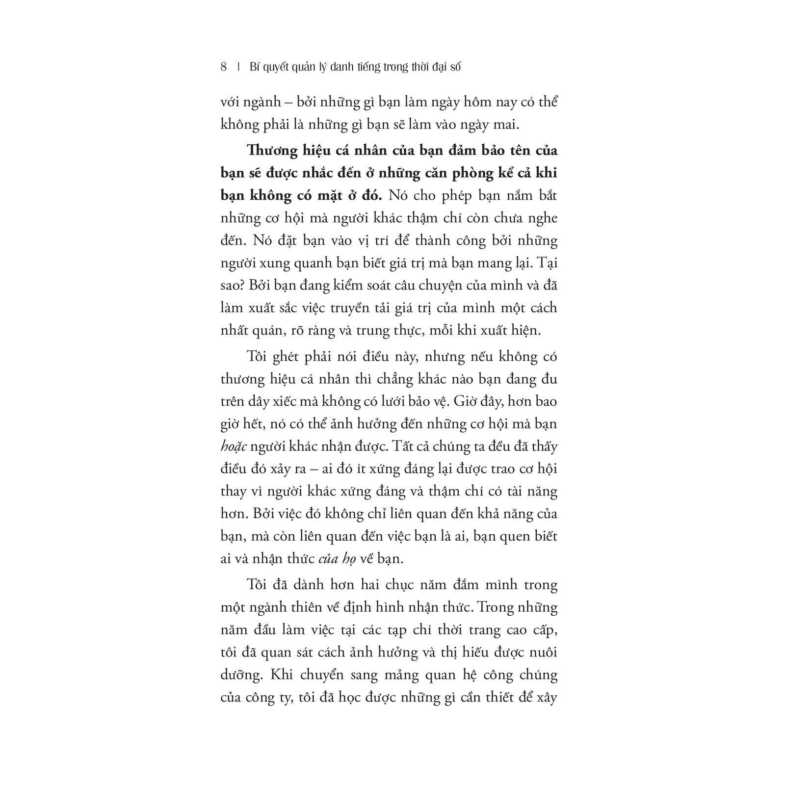 Có thể coi Bí quyết quản lý danh tiếng trong thời đại số là cuốn cẩm nang hướng dẫn độc giả xác định câu chuyện thương hiệu của riêng mình dựa trên kinh nghiệm, đam mê và mục tiêu nghề nghiệp.