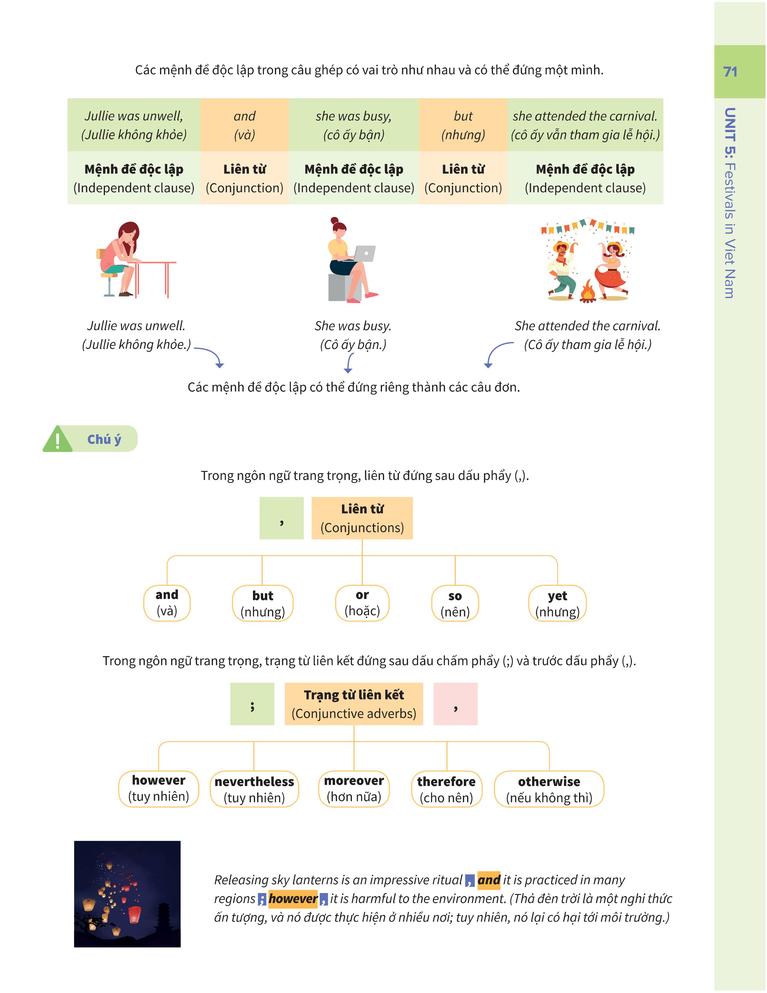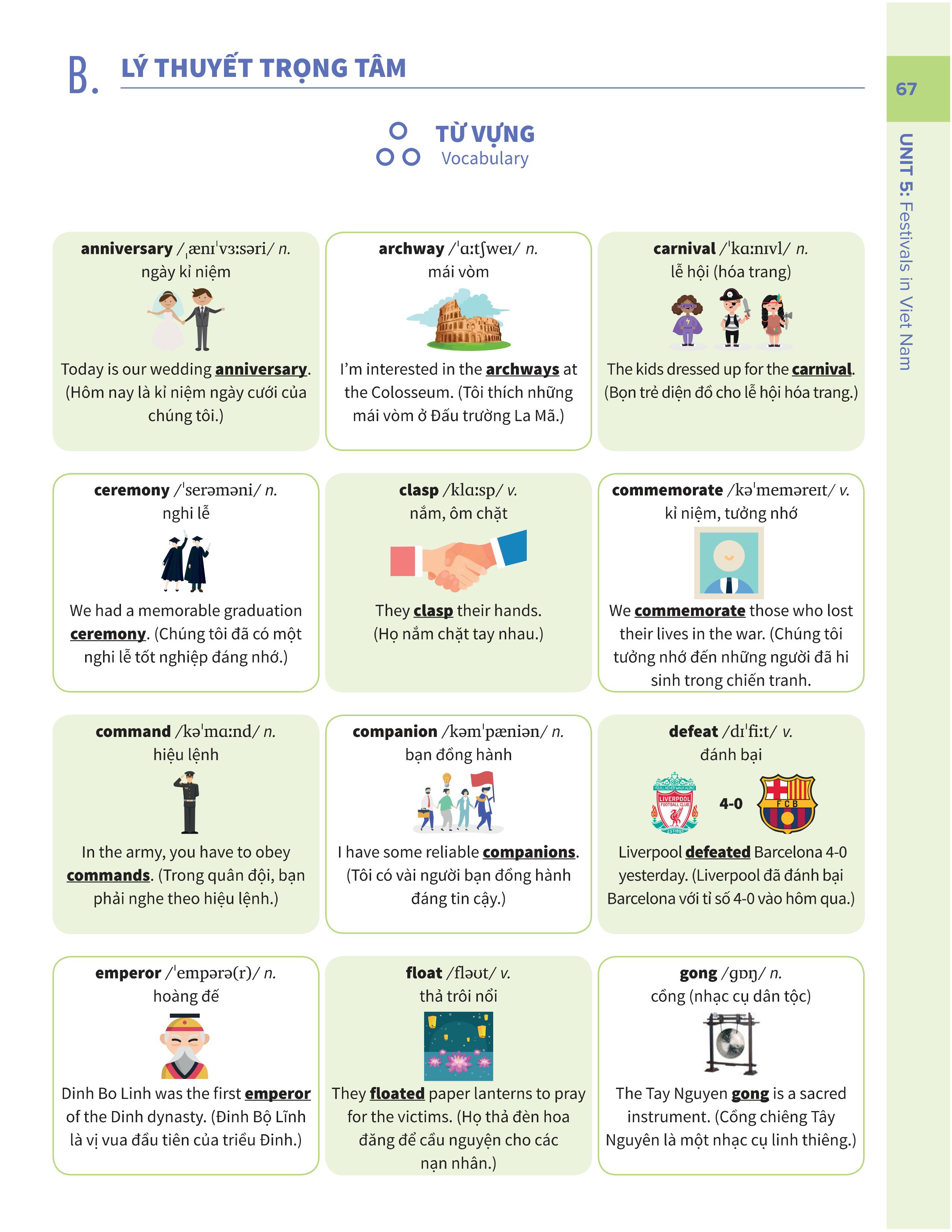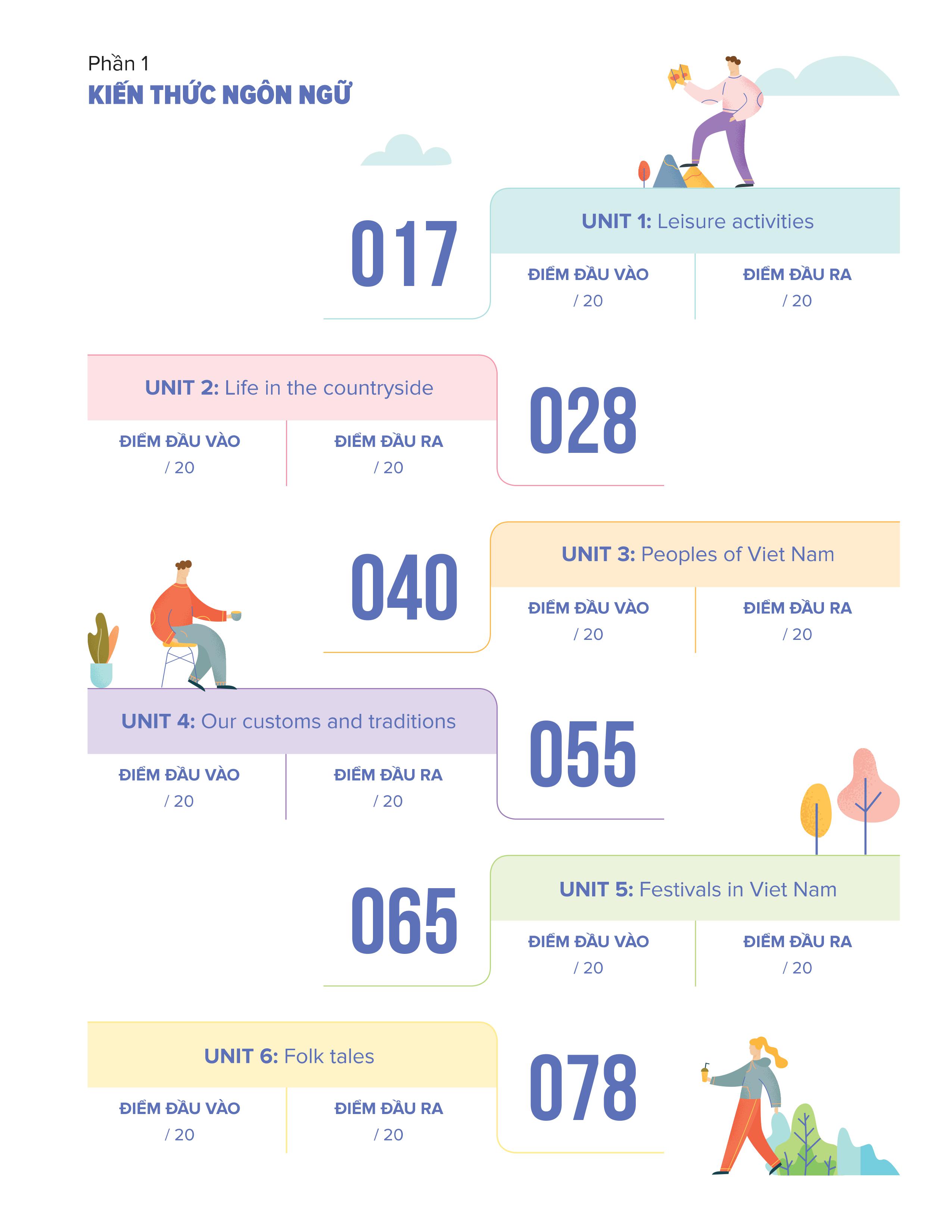 Kiến thức ngôn ngữ bao gồm các kiến thức về ngữ âm, từ vựng và ngữ pháp. Đây là những kiến thức cơ bản, nền tảng cho việc học bất cứ một ngôn ngữ nào, trong đó có tiếng Anh. Các kiến thức này được tổ chức theo từng đơn vị bài (Unit) với các chủ đề khác nhau như Life in the country, People of Vietnam, Festival in V Nhờ vậy, học sinh có thể mở rộng vốn từ vựng, đồng thời tích luỹ thêm những kiến thức tự nhiên và xã hội hữu ích. Đặc biệt, các lí thuyết này được trình bày dưới dạng infographic - phương pháp học tập hiện đại, tiên tiến trên thế giới. Sẽ không còn những dòng lí thuyết dài dằng dặc, hàn lâm, khó hiểu nữa; thay vào đó là những sơ đồ tư duy, bảng biểu, hình ảnh, đồ hoạ sinh động, bắt mắt, giúp học sinh tìm được cảm hứng học tập - một yếu tố rất quan trọng đối với việc học Tiếng Anh hiệu quả.
