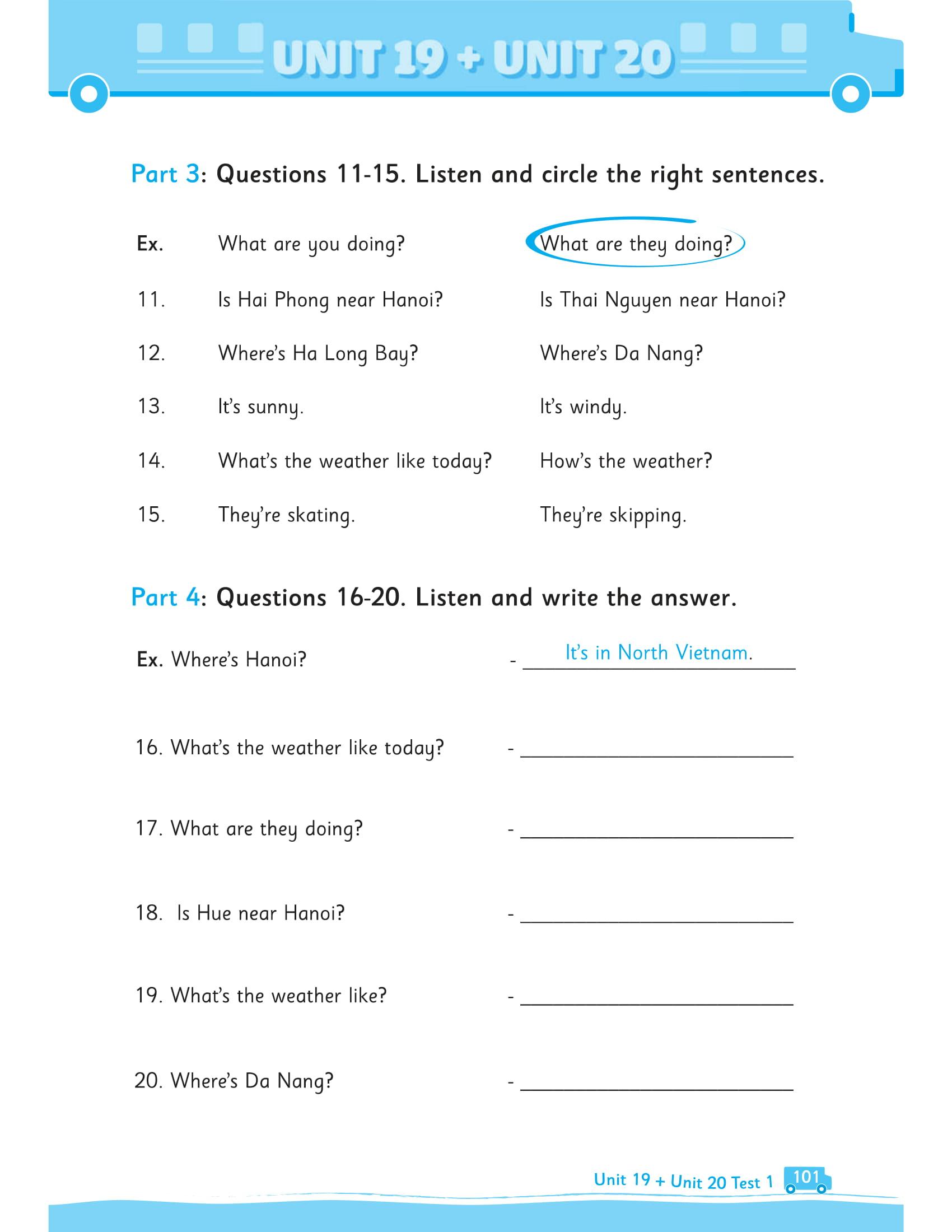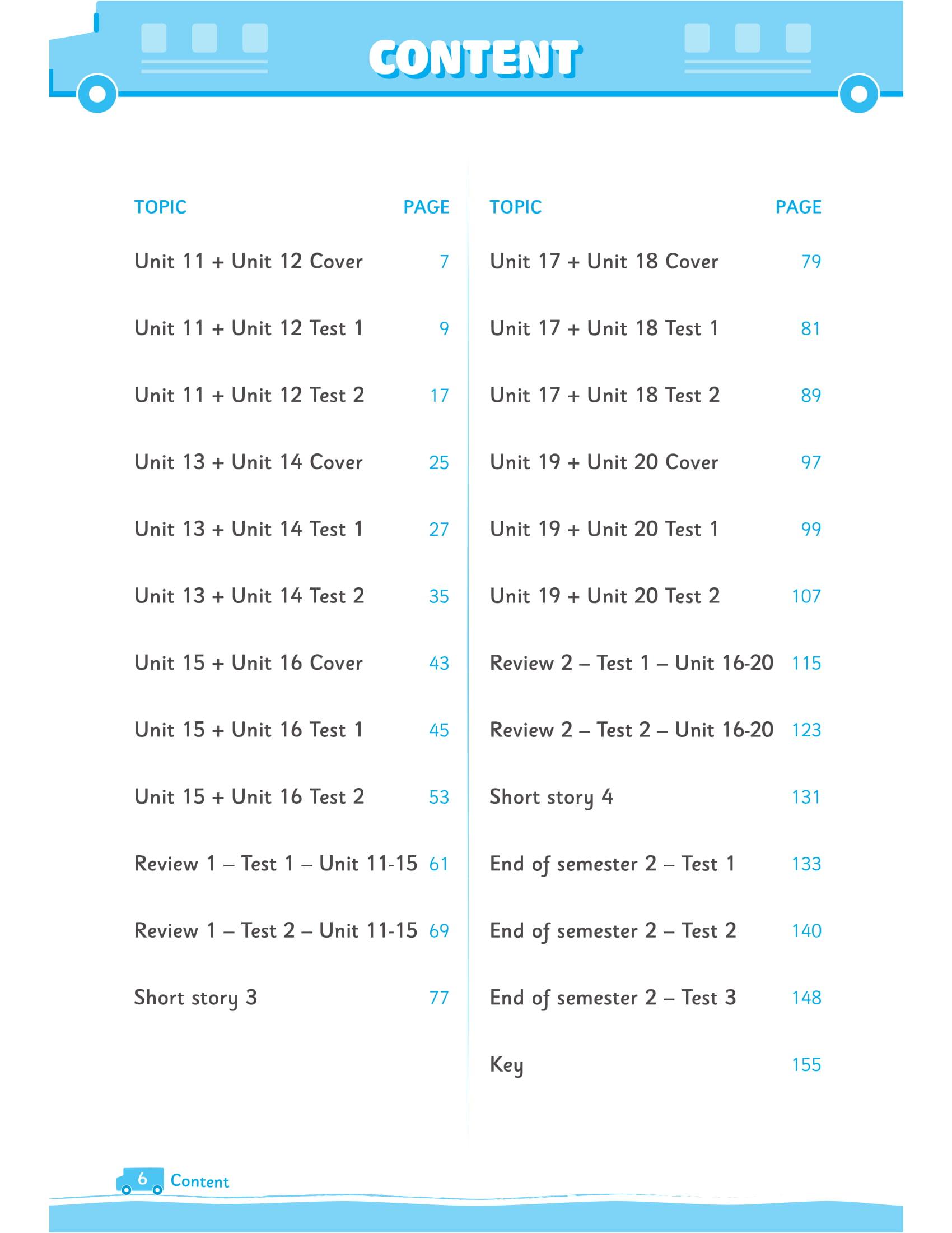 Cứ hai bài sẽ có 2 bài kiểm tra, tất cả các bài kiểm tra đều được thiết kế theo quy định thông tư mới nhất về kiểm tra môn Tiếng Anh tiểu học.