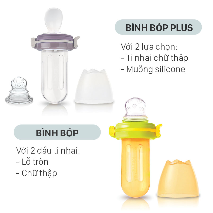 • Bình bóp có 2 loại: 1 loại thường (dành cho ăn dặm cháo bột) và 1 loại Plus (dành cho chống hóc) có thêm muỗng silicone.