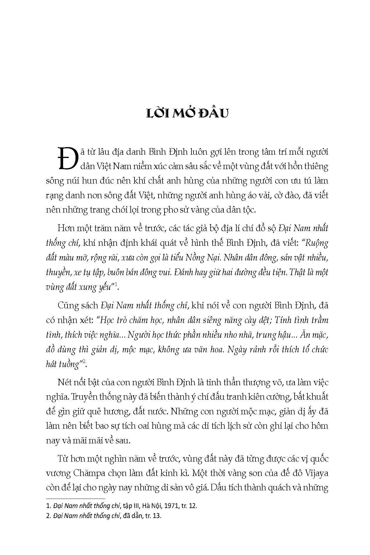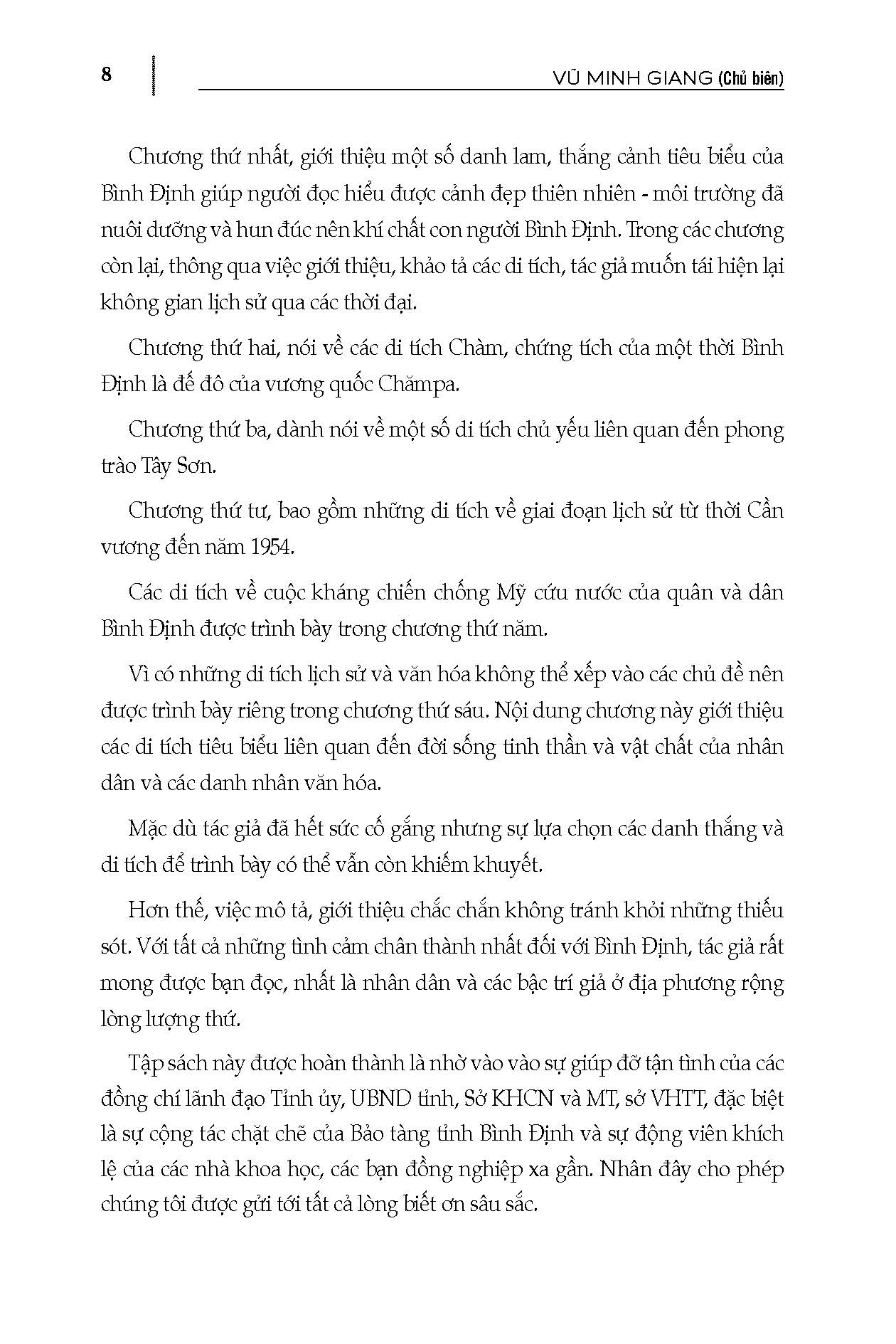 Mua tại TiktokBình Định luôn gợi lên trong tâm trí mỗi người dân Việt Nam niềm cảm xúc sâu sắc về một vùng đất với hồn thiêng sông núi hun đúc nên khí chất anh hùng của những người con ưu tú làm rạng danh non sông đất Việt, những người anh hùng áo vải, cò đào đã viết nên những trang chói lọi trong pho sử vàng của dân tộc.Sách giới thiệu một số danh lam, thắng cảnh tiêu biểu của Bình Định giúp người đọc hiểu được cảnh đẹp thiên nhiên - môi trường đã nuôi dưỡng và hun đúc nên khí chất con người Bình Định; đồng thời giới thiệu, khảo tả các di tích, tác giả muốn tái hiện lại không gian lịch sử qua các thời đại; các di tích tiêu biểu liên quan đến đời sống tinh thần và vật chất của nhân dân và các danh nhân văn hóa.