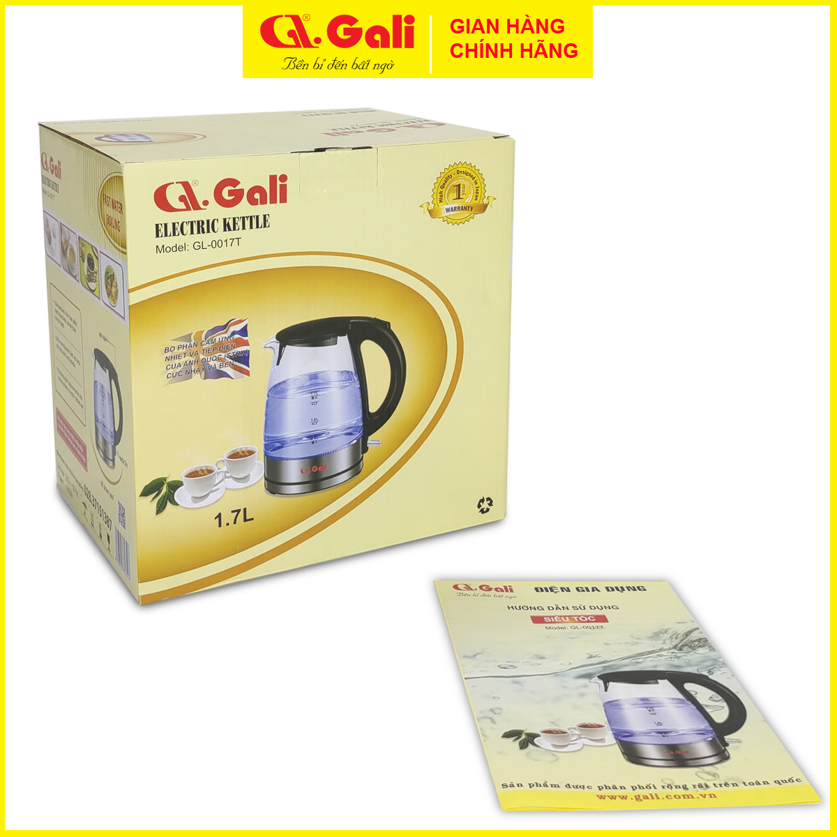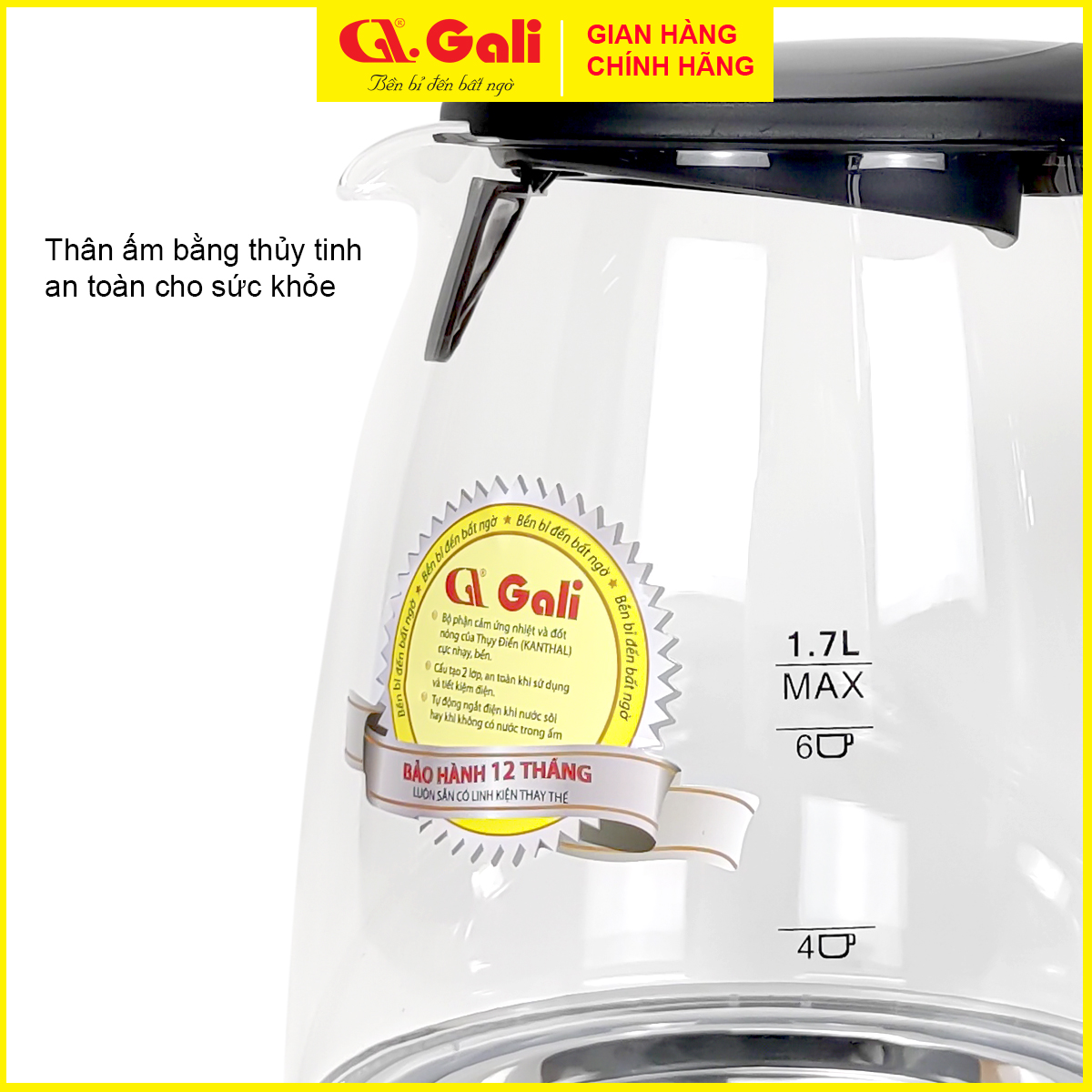 Ấm đun nước siêu tốc Gali 1,7 lít thân thủy tinh mâm đúc inox 304 bảo hành 12 tháng