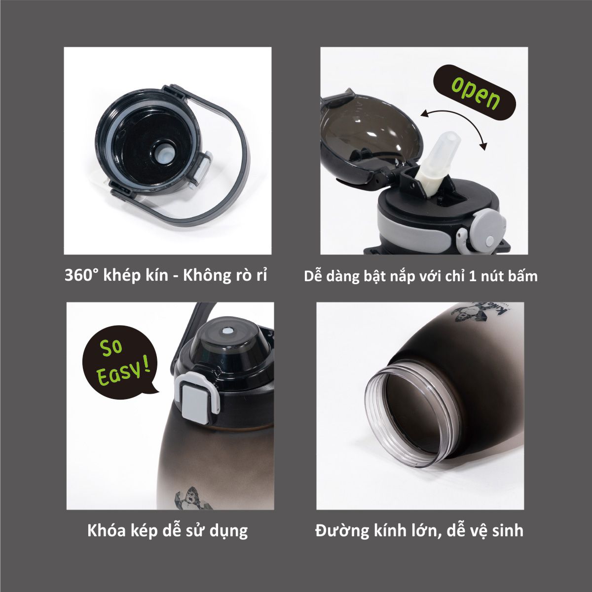 - Nắp bình: polypropylen PP (chịu nhiệt 100 độ C) + PCT (Tritan) (chịu nhiệt 100 độ C)
