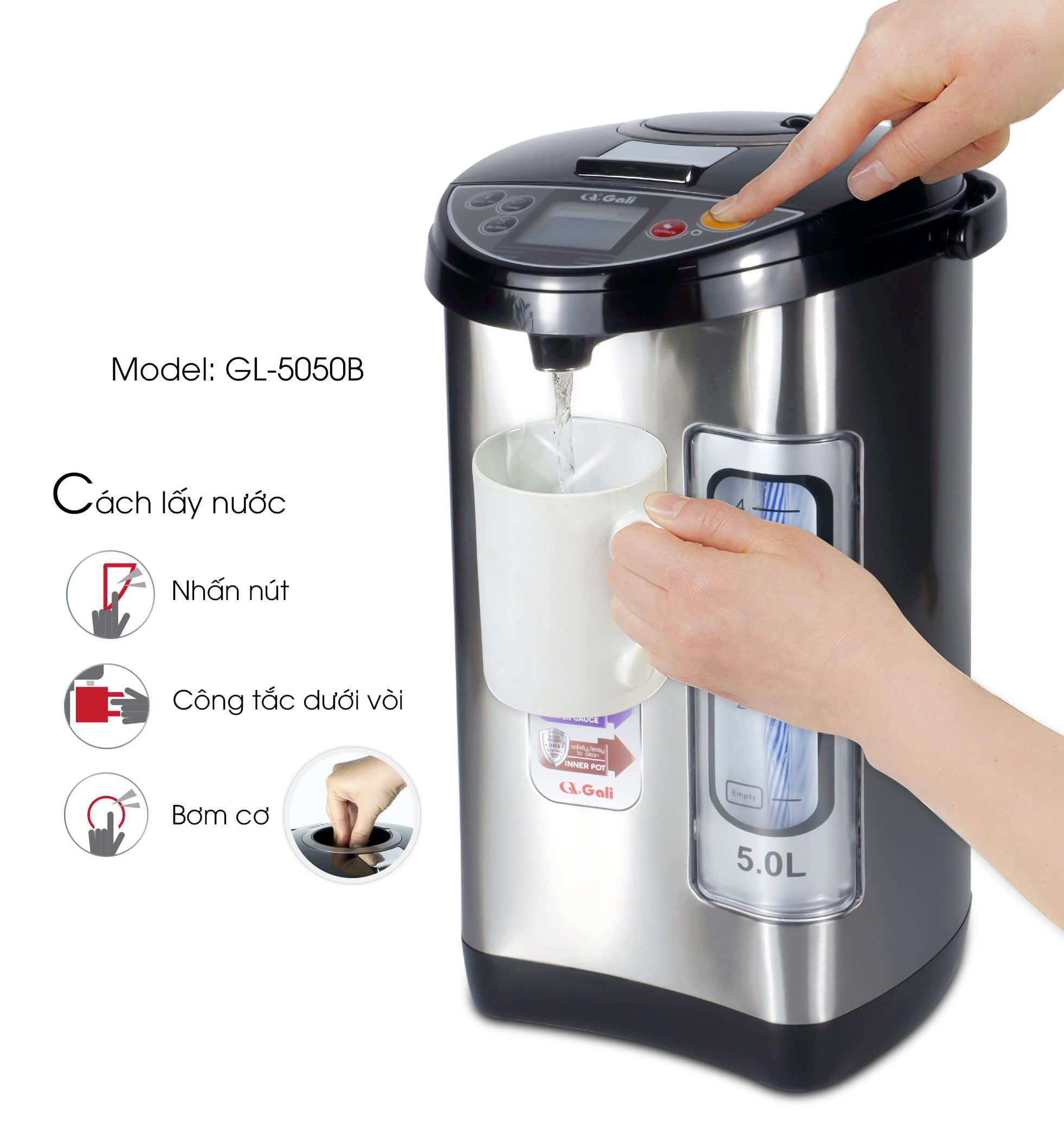 Bình thủy điện Gali GL-5050B 5L – Giữ ấm đa nhiệt, khóa an toàn, tiện nghi cho cả nhà!