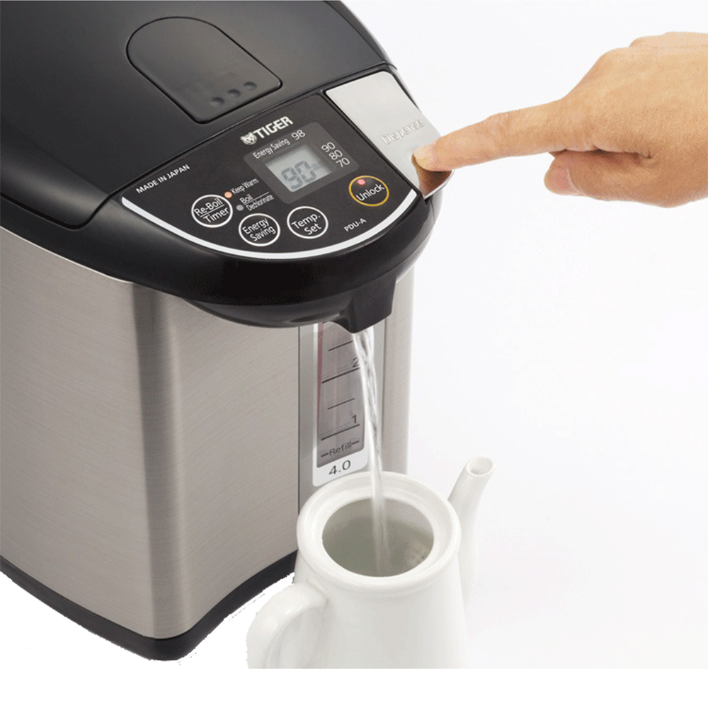 Bình Thủy Điện TIGER PDR-S40W   Dung tích 4 lít – Nhiệt độ nước nóng có thể được điều chỉnh theo nhu cầu của bạn. Chọn từ 98 °C, 90 °C, 80 °C và 70