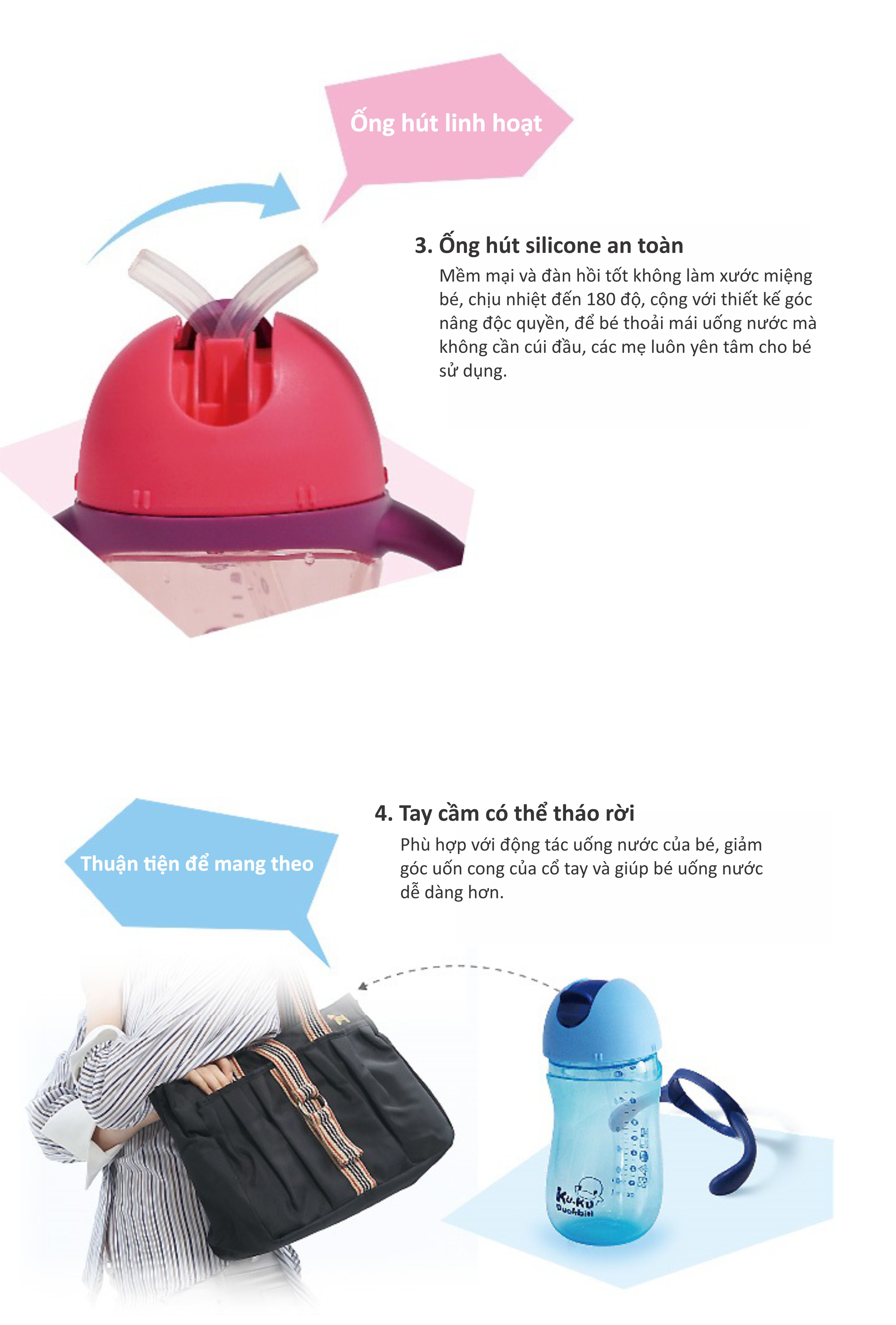 - Chất liệu nhựa PP và silicone cao cấp, không chứa BPA, an toàn cho sức khỏe của bé; - Thiết kế tiện dụng, ống hút sẽ bật ra ngay khi bạn nhấn, sử dụng