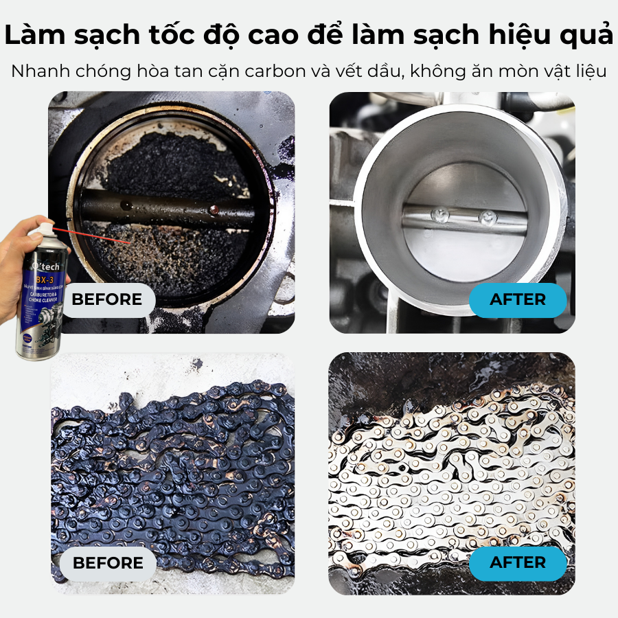 Mua tại TiktokBình xịt dầu vệ sinh bình xăng con O’tech BX-3 TÍNH NĂNG Bình xịt dầu vệ sinh bình xăng con BX-3 là một dung môi cực mạnh cho phép bạn làm sạch bộ chế hòa khí mà không cần tháo dỡ ra. Đơn giản chỉ cần xịt nó vào lỗ thông hơi của buồng phao để làm sạch bụi bẩn, cặn caron bên trong và xuống cổ họng một cách nhanh chóng và hiệu quả. Song song có thể xịt lên bên ngoài để làm sạch bên ngoài. Được dùng cho các xe máy, mô tô, ô tô, động cơ, thiết bị tàu thuyền, hàng không, cơ khí, thiết bị công nghiệp,… Ngoài ra bình xịt BX-3 còn dùng để vệ sinh dầu nhớt bám lâu ngày, vệ sinh sên, dùng được cho sên có phốt cao su. THÀNH PHẦN VÀ CÔNG DỤNG BÌNH XỊT VỆ SINH BÌNH XĂNG CON Dầu vệ sinh bình xăng con O’tech BX-3 với các thành phần như DICHLOROMETHANE (METHYLENE CHLORIDE), METHYL ALCOHOL (METHANOL), METHYLBENZENE (TOLUENE), DIMETHYL ETHER. Mang lại nhiều lợi ích trong việc bảo dưỡng và tối ưu hóa hiệu suất của động cơ. Dưới đây là một số lợi ích cụ thể từng thành phần mang lại: