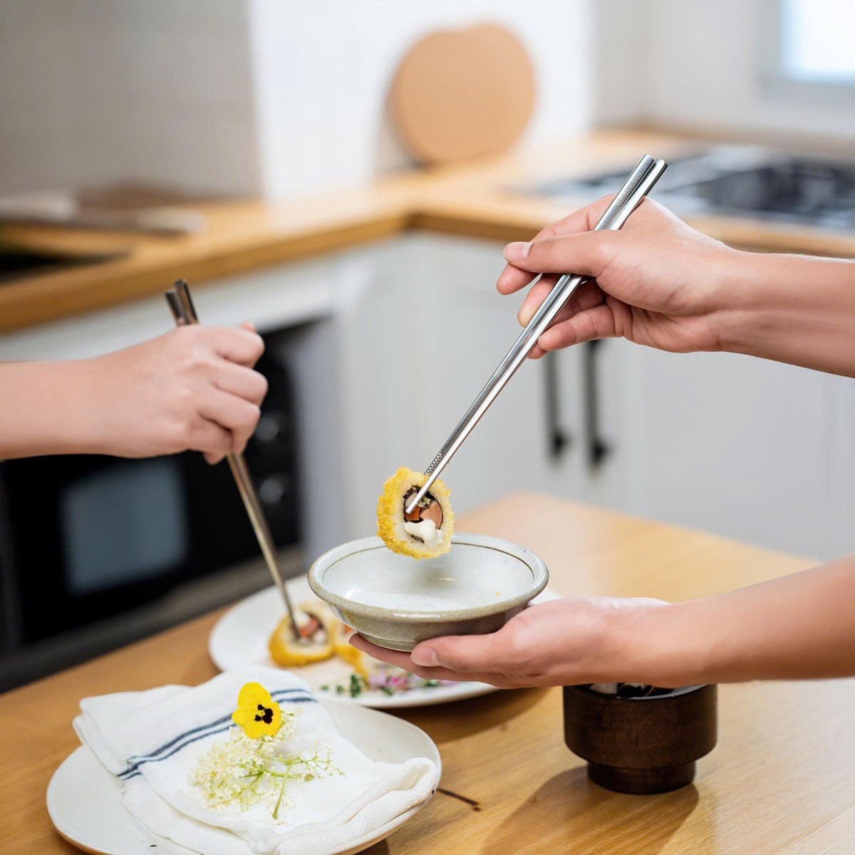Hộp 5 đôi đũa inox 316 cao cấp Kalpen T4 chuẩn Châu Âu Tên sản phẩm: Đũa inox 316 cao cấp Kalpen Model: T4 Thương hiệu: Kalpen Chất liệu: Inox 316 cao cấp Chiều dài: 23,5 cm Trọng lượng: 29g/đôi Số