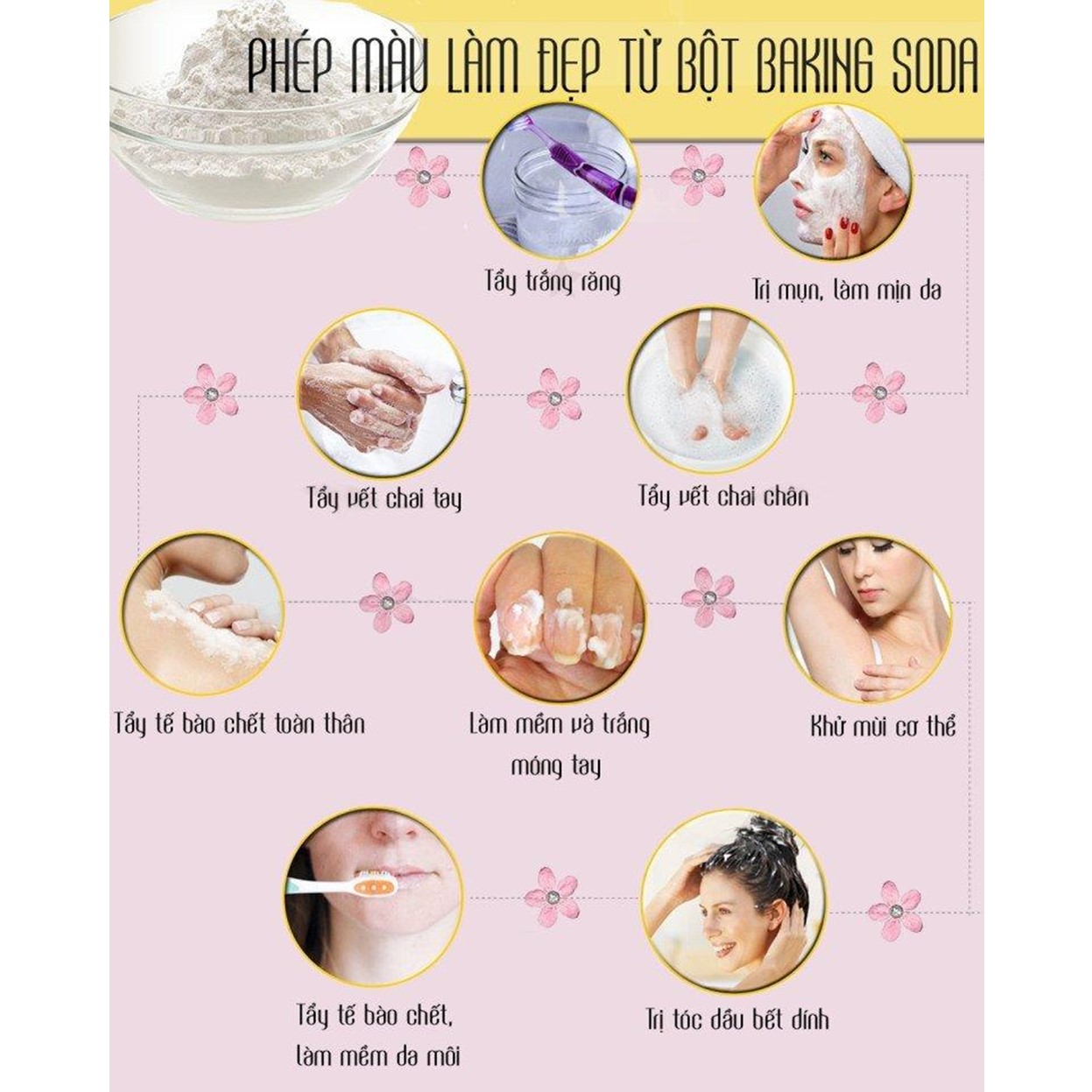 - Đánh bay mụn đầu đen: Một muỗng cà phê Baking Soda trộn đều với một muỗng nước lọc rồi thoa lên vùng da có mụn đầu đen, để yên và thư giãn trong khoảng 10 phút, sau đó lau khô bằng khăn sạch, làm một vài lần bạn sẽ thấy mụn đầu đen giảm đi đáng kể đấy. - Giảm mụn trứng cá: Trộn đều baking soda với nước với tỷ lệ 1:1 sau đó thoa lên phần da bị mụn, giữ trong khoảng 10 phút sau đó lau khô bằng khăn sạch. Làm thường xuyên như vậy bạn đã có một làn da sạch mụn đến bất ngờ. - Loại bỏ các tế bào chết: Trộn đều baking soda với nước ấm, dùng chúng bôi lên vùng da muốn tẩy da chết, mát xa nhẹ nhàng sau đó sửa lại với nước ấm. Bạn sẽ cảm nhận được da được sạch sẽ bất ngờ, mềm mịn hơn nhiều ngay từ lần đầu tiên sử dụng đấy. - Tẩy tế bào chết cho toàn bộ cơ thể: Baking Soda được xem như một hoạt chất tẩy rửa đặc biệt hiệu quả và an toàn. Trộn 3 thìa Baking Soda cùng với 1 thìa bột yến mạch xay và thêm 3 thìa nước. Dùng hỗn hợp này và trà nhẹ lên toàn bộ cơ thể theo vòng tròn sau đó rửa sạch cùng với nước ấm. - Làm mềm mịn da mặt: Trộn một thìa Baking Soda cùng với 3 thìa nước, rồi nhẹ nhàng massage hỗn hợp lên da mặt trong thời gian khoảng 1 phút theo vòng tròn rồi sau đó rửa thật sạch. Thực hiện điều này khoảng 2 lần mỗi tuần cho làm cho da mặt bạn mềm và mịn hơn trông thấy.