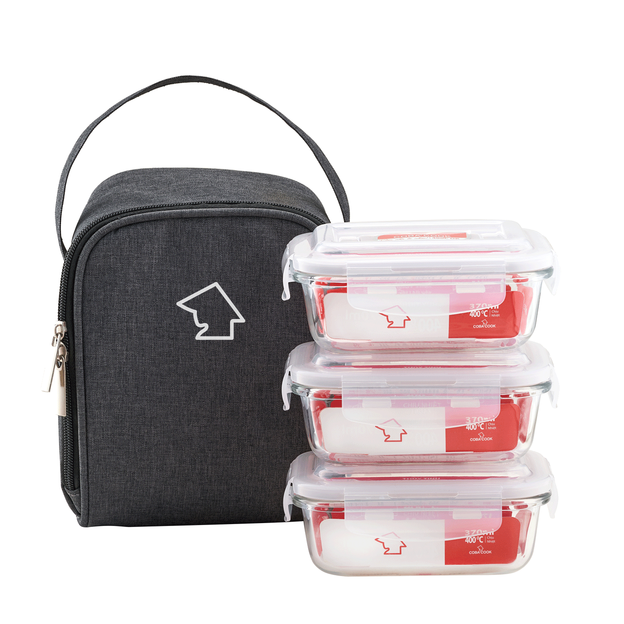Bộ 3 hộp đựng cơm thủy tinh COBA'COOK chịu nhiệt 3 hộp chữ nhật 370ml và 1 túi simili - CCL33BS-1