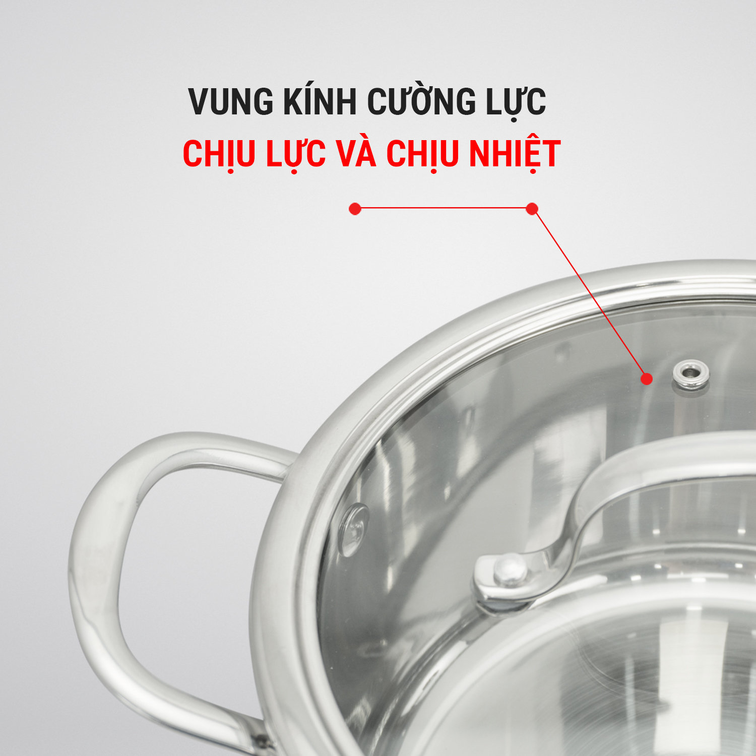 Vung nồi được làm từ kính cường lực trong suốt dày 4mm người dùng dễ dàng quan sát thực phẩm bên trong. Vung thiết kế phẳng, chống dồn hơi ra mép và có lỗ thông hơi chống trào hiệu quả.
