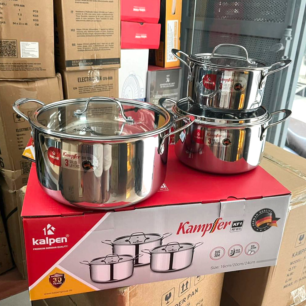 Bộ 3 nồi inox 3 lớp liền khối Kalpen Kampfer KF1 size 16/20/24cm bảo hành 30 năm