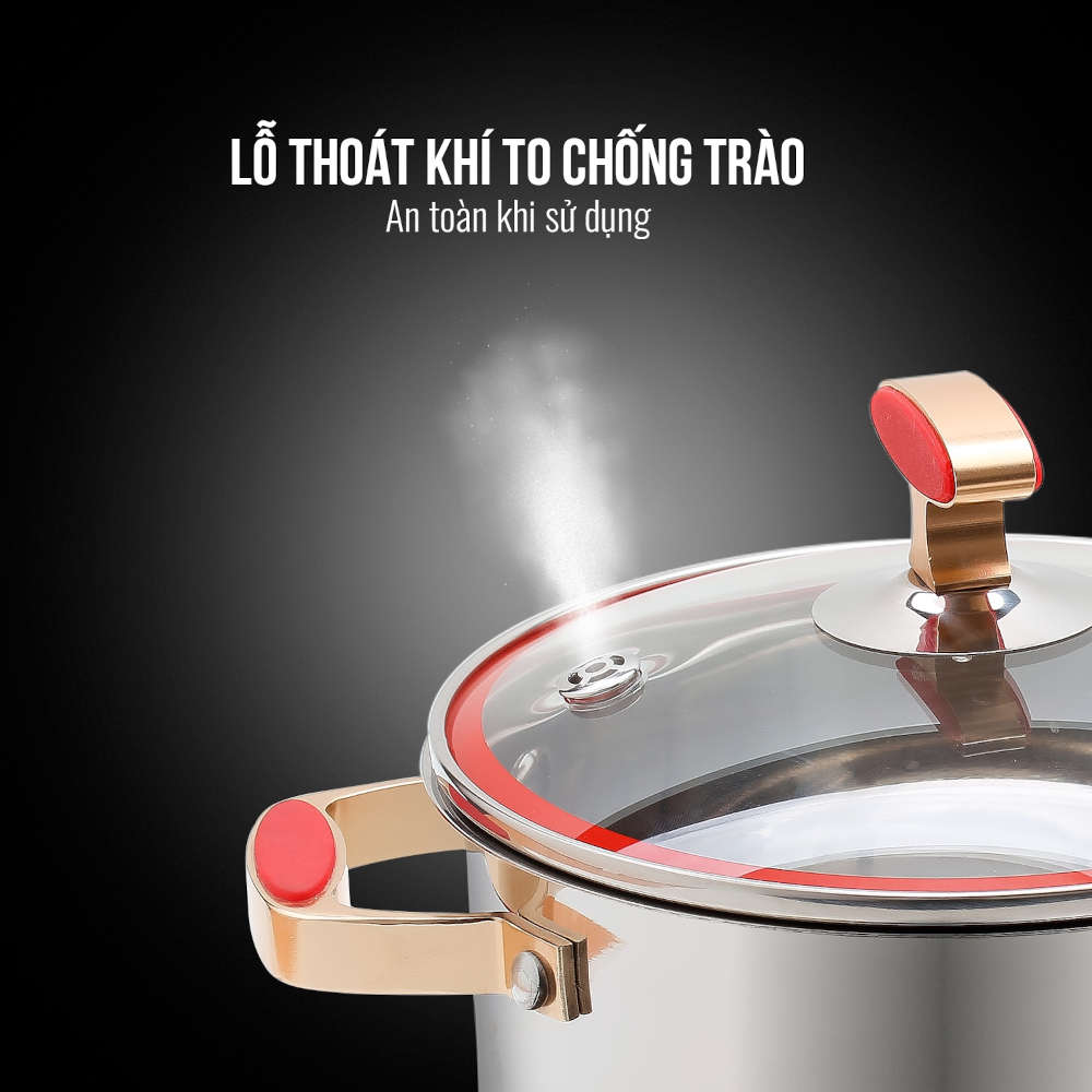 - Nắp kính trong suốt có lỗ thoát hơi tiện lợi còn giúp bạn theo dõi được quá trình làm chín thực phẩm bên trong nồi. Quai đinh tán màu vàng chắc chắn và núm nắp được đệm silicone cách nhiệt, thuận tiện cho việc thao tác và di chuyển nồi ngay cả khi còn nóng. Thước đo mực nước rõ ràng, dễ quan sát để bạn lấy chính xác lượng nước, lượng thực phẩm cần nấu.
