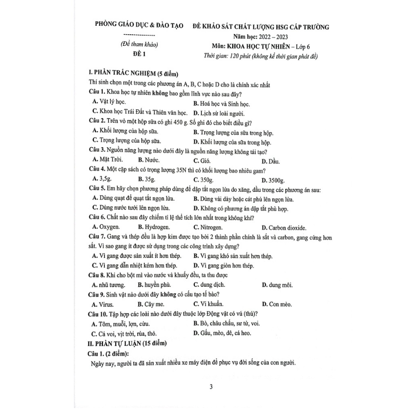 khoa học tự nhiên 6 - thi giữa học kì 2 - năm 2021 2022
