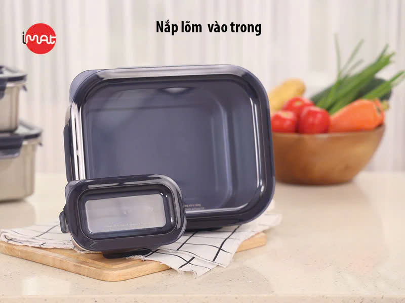 Nắp làm từ nhựa PP, thiết kế lõm xuống giúp xếp chồng lên nhau tiện lợi hơn và cũng nhắc nhở chúng ta không nên đựng thực phẩm đầy đến tận nắp.