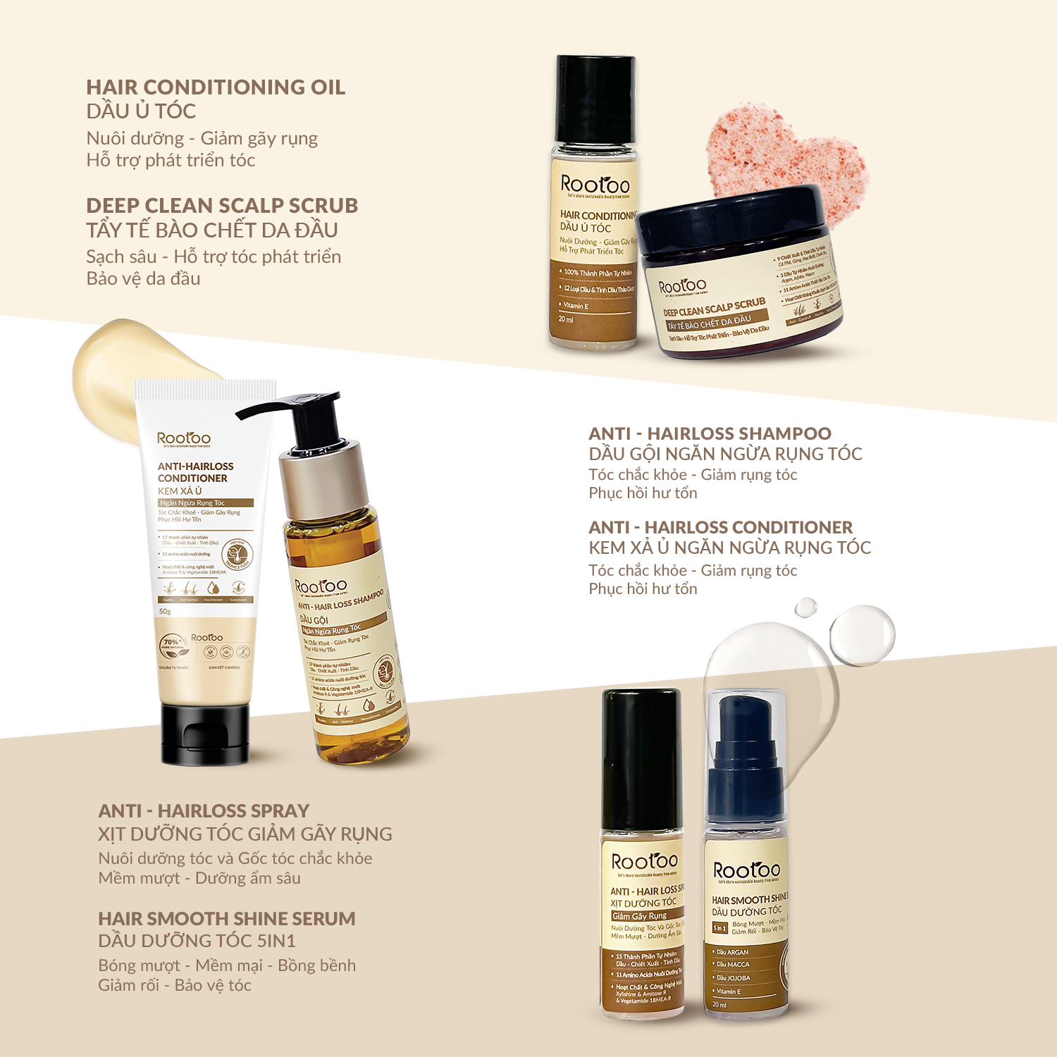 Combo 6 sản phẩm Haircare Collection ROOTOO cho mái tóc bồng bềnh tự nhiên Combo 6 sản phẩm: Dầu Ủ Dưỡng Tóc ROOTOO Thuần Tự Nhiên Giúp Tóc Mềm Mượt, Kích Thích Mọc Tóc Và Phục Hồi Hư Tổn (20ml) Tẩy Tế Bào Chết Da Đầu ROOTOO Thuần Tự Nhiên Giúp Sạch Sâu Da Đầu, Ngăn Ngừa Rụng Và Chống Bết Tóc (50g) Dầu Gội Ngăn Ngừa Rụng Tóc ROOTOO Thuần Tự Nhiên Giúp Kích Thích Mọc Tóc, Giảm Gàu, Phục Hồi Hư Tổn (45ml) Kem Xả Ủ Ngăn Ngừa Rụng Tóc ROOTOO Thuần Tự Nhiên Giúp Dưỡng Ẩm, Mềm Mượt Và Phục Hồi Hư Tổn (50g) Xịt Dưỡng Tóc ROOTOO Thuần Tự Nhiên Giúp Dưỡng Ẩm, Kích Thích Mọc Tóc Và Phục Hồi Hư Tổn (20ml) Dầu Dưỡng Tóc Rootoo Thuần Tự Nhiên Giúp Tóc Bóng Mượt, Mềm Mại, Bồng Bềnh (20ml) THÔNG TIN SẢN PHẨM: