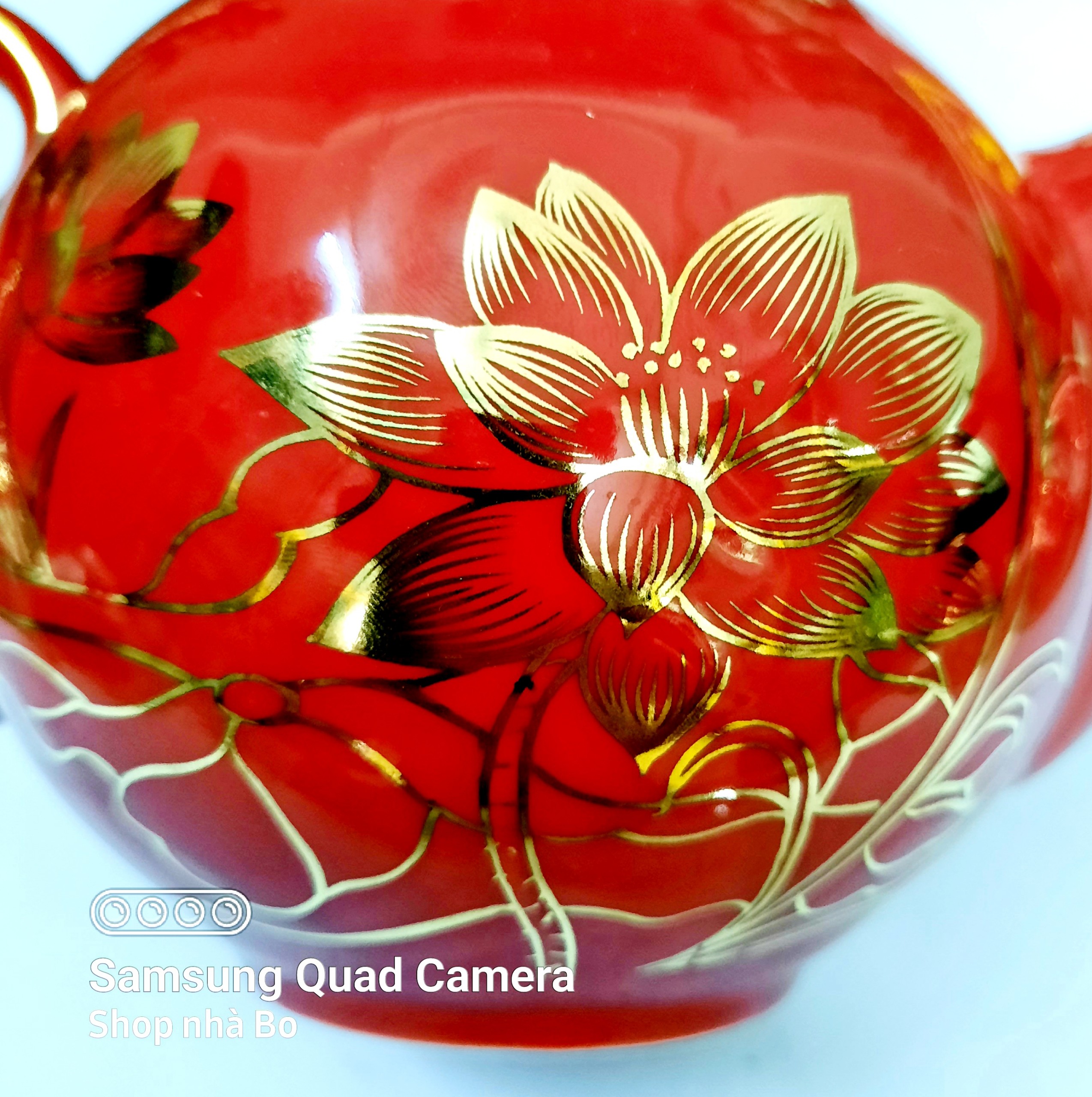 Bộ ấm chén Bát Tràng cao cấp mẫu đơn đỏ vẽ sen vàng