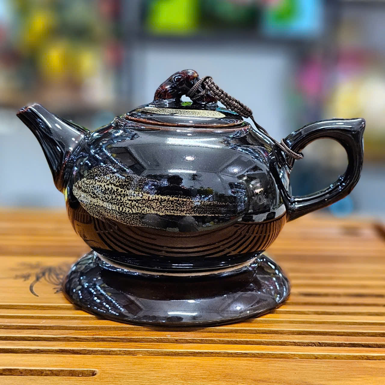 Bộ ấm chén gốm Bát tràng men đen hoả biến phẩy gấm chén lòng hoa full phụ kiện siêu đẹp!