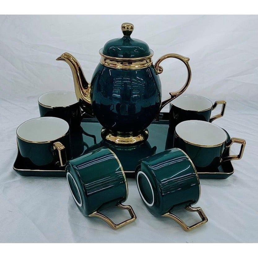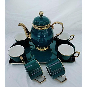 ✨BỘ ẤM CHÉN KÈM KHAY SỨ MÀU XANH NGỌC VIỀN VÀNG DÁNG BẦU
