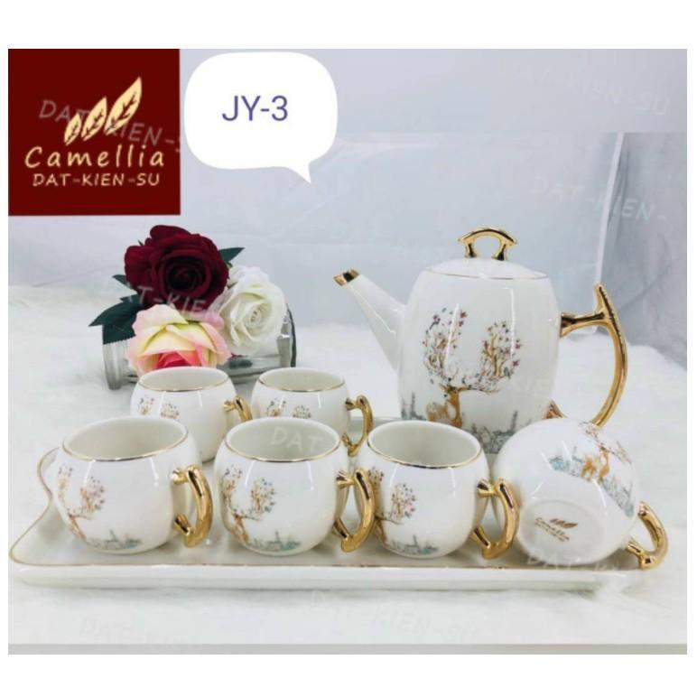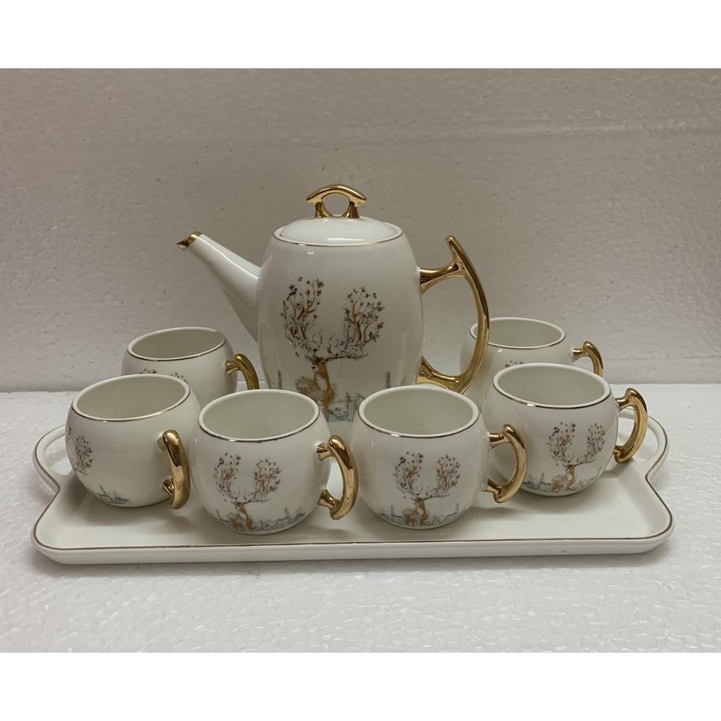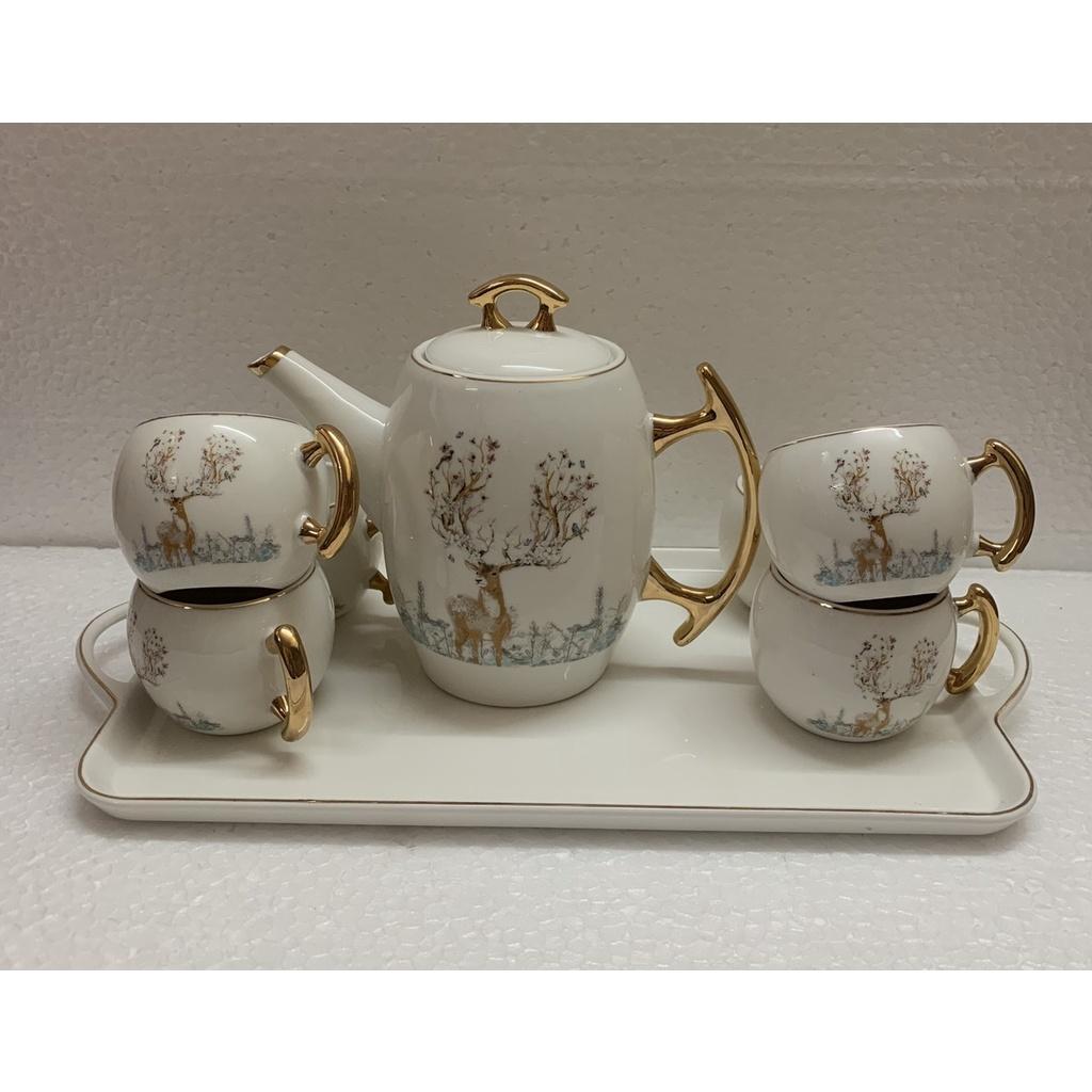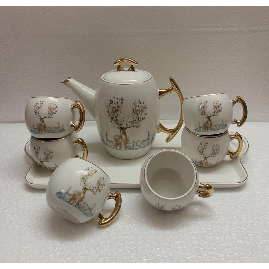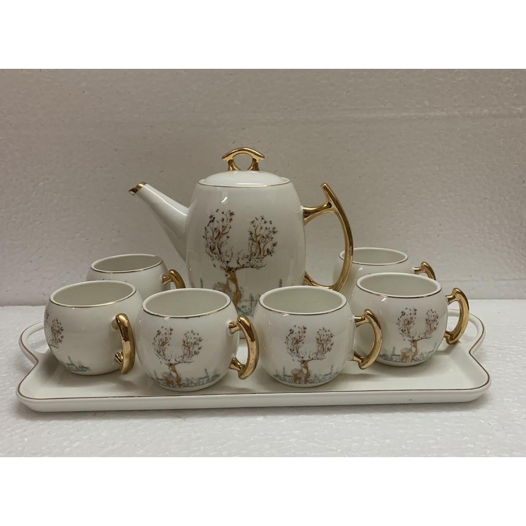 ✨Bộ ấm chén kèm khay sứ pha trà trắng họa tiết hươu rừng