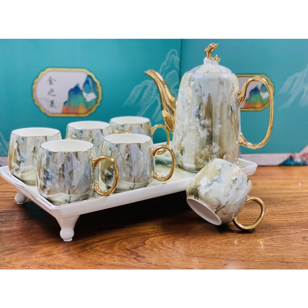 Bộ ấm chén Bát Tràng phú quý men xanh lục ngọc bảo họa tiết Phúc - Lộc - Thọ vẽ vàng 24k - Là sản phẩm hội tụ được nét tinh xảo của bàn tay