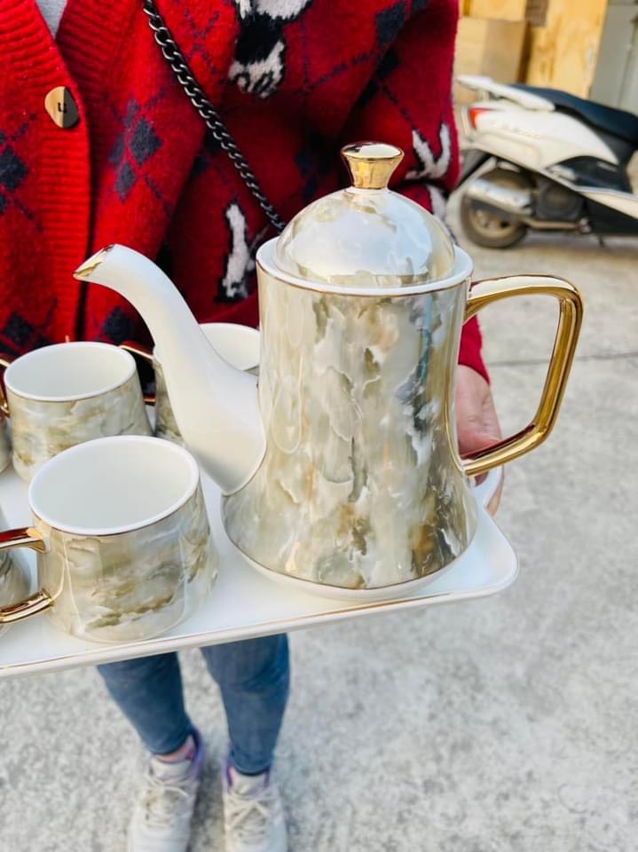 ✨BỘ ẤM CHÉN KÈM KHAY SỨ XƯƠNG CAO CẤP VÂN ĐÁ PHA TRÀ CÀ PHÊ PHONG CÁCH CHÂU
