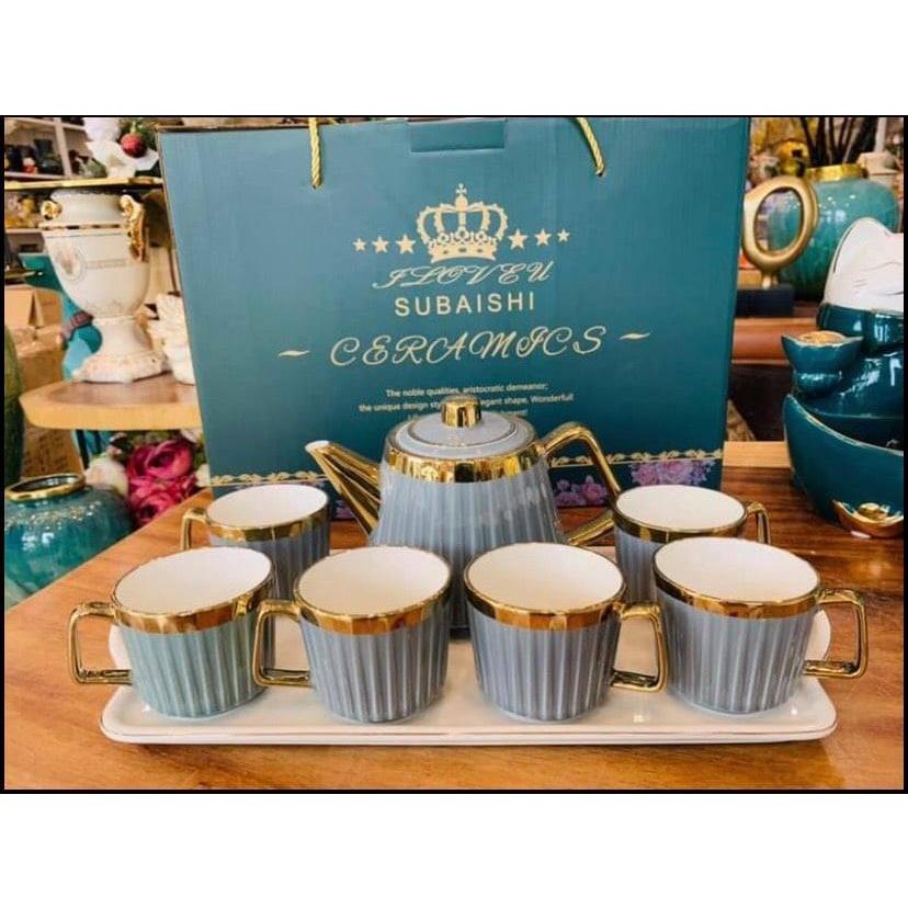 ✨BỘ ẤM CHÉN PHA TRÀ CÀ PHÊ DÁNG THẤM MÀU GHI VIỀN VÀNG