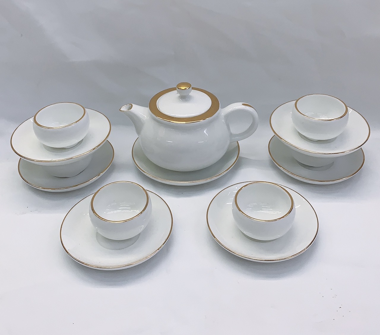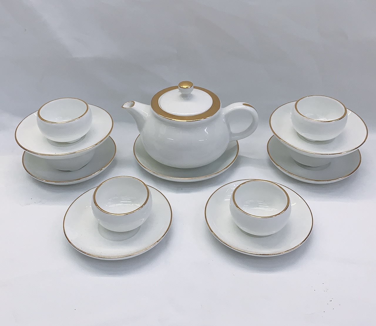 Bộ ấm chén Bát Tràng men trắng viền vàng kim dáng phú quý kèm hộp làm quà tặng sang trọng Với chất men trắng tinh khôi không tỳ vết, từ chén, đĩa, ấm, nắp
