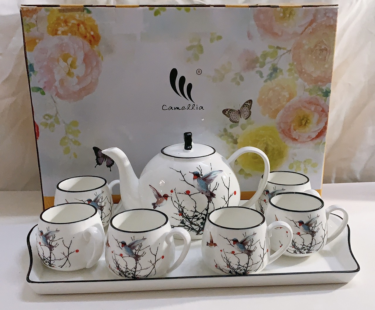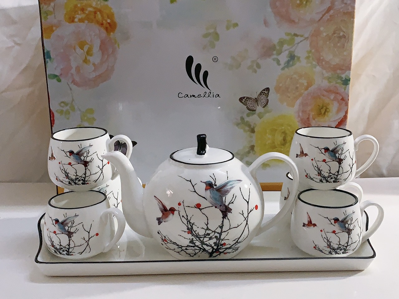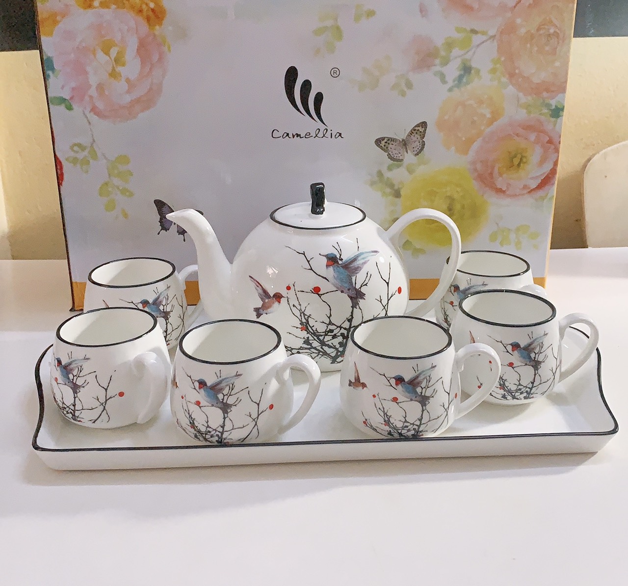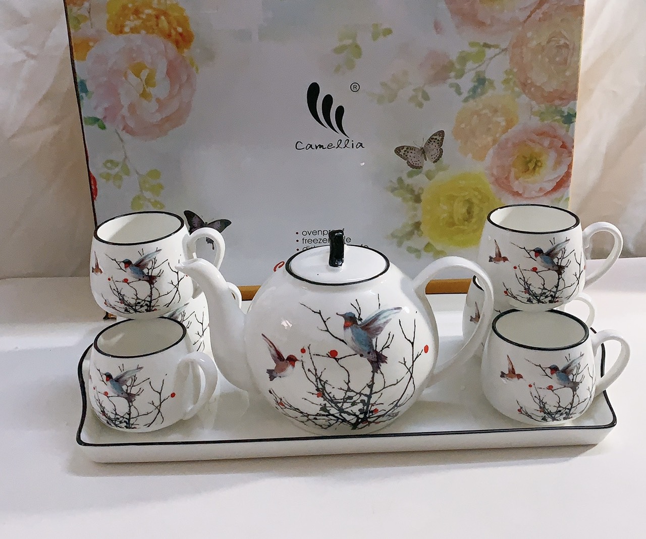 Hộp xốp và giấy bảo vệ đẹp Hoa văn trang nhã và giản dị. Bộ bình cốc sứ cao cấp: Chất liệu sứ sáng , bóng, mỏng và rất nhẹ. Không có họa tiết sử dụng kim loại nên an toàn về sức khỏe.